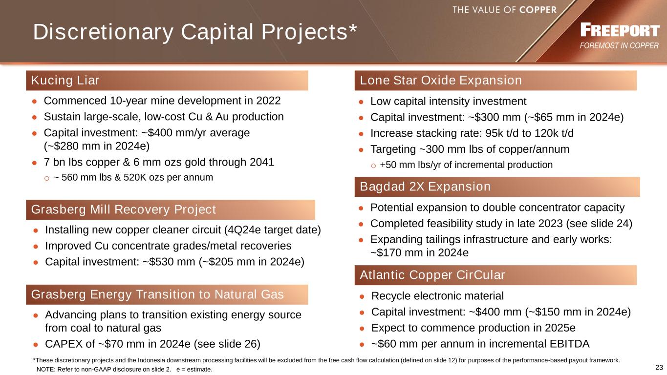 23 Discretionary Capital Projects* ● Commenced 10-year mine development in 2022 ● Sustain large-scale, low-cost Cu & Au production ● Capital investment: ~$400 mm/yr average (~$280 mm in 2024e) ● 7 bn lbs copper & 6 mm ozs gold through 2041 o ~ 560 mm lbs & 520K ozs per annum Kucing Liar ● Recycle electronic material ● Capital investment: ~$400 mm (~$150 mm in 2024e) ● Expect to commence production in 2025e ● ~$60 mm per annum in incremental EBITDA Atlantic Copper CirCular Lone Star Oxide Expansion ● Low capital intensity investment ● Capital investment: ~$300 mm (~$65 mm in 2024e) ● Increase stacking rate: 95k t/d to 120k t/d ● Targeting ~300 mm lbs of copper/annum o +50 mm lbs/yr of incremental production Grasberg Mill Recovery Project ● Installing new copper cleaner circuit (4Q24e target date) ● Improved Cu concentrate grades/metal recoveries ● Capital investment: ~$530 mm (~$205 mm in 2024e) *These discretionary projects and the Indonesia downstream processing facilities will be excluded from the free cash flow calculation (defined on slide 12) for purposes of the performance-based payout framework. NOTE: Refer to non-GAAP disclosure on slide 2. e = estimate. ● Potential expansion to double concentrator capacity ● Completed feasibility study in late 2023 (see slide 24) ● Expanding tailings infrastructure and early works: ~$170 mm in 2024e Bagdad 2X Expansion Grasberg Energy Transition to Natural Gas ● Advancing plans to transition existing energy source from coal to natural gas ● CAPEX of ~$70 mm in 2024e (see slide 26)