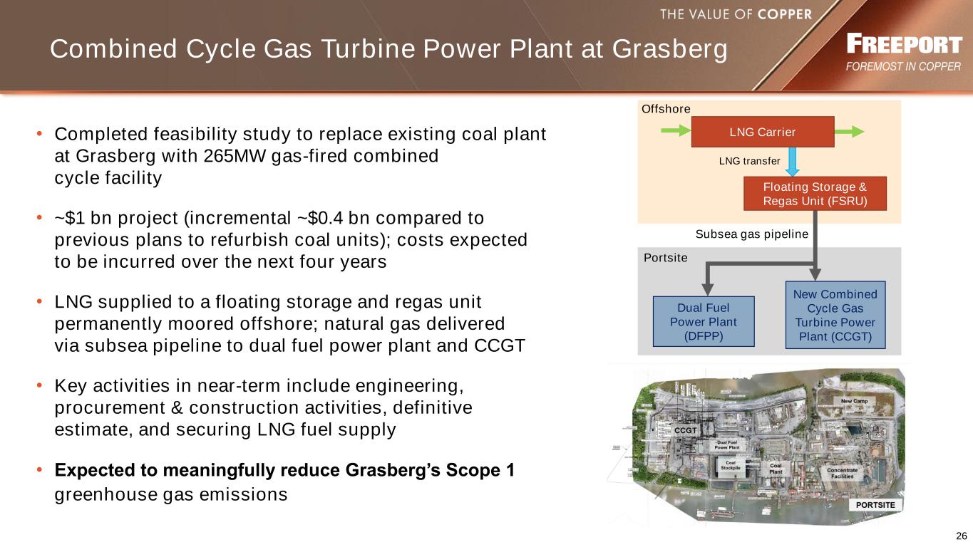 26 Combined Cycle Gas Turbine Power Plant at Grasberg • Completed feasibility study to replace existing coal plant at Grasberg with 265MW gas-fired combined cycle facility • ~$1 bn project (incremental ~$0.4 bn compared to previous plans to refurbish coal units); costs expected to be incurred over the next four years • LNG supplied to a floating storage and regas unit permanently moored offshore; natural gas delivered via subsea pipeline to dual fuel power plant and CCGT • Key activities in near-term include engineering, procurement & construction activities, definitive estimate, and securing LNG fuel supply • Expected to meaningfully reduce Grasberg’s Scope 1 greenhouse gas emissions New Combined Cycle Gas Turbine Power Plant (CCGT) Dual Fuel Power Plant (DFPP) Subsea gas pipeline Portsite LNG transfer Offshore LNG Carrier Floating Storage & Regas Unit (FSRU)