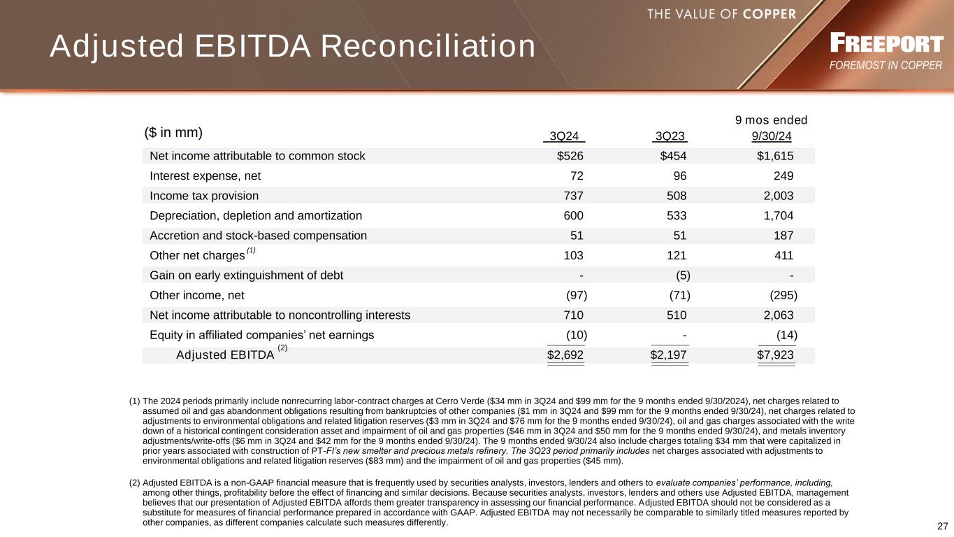 PHOENIX, AZ, October 22, 2024 – Freeport (NYSE: FCX) reported third-quarter 2024 net income attributable to common stock of $526 million, $0.36 per share, and adjusted net income attributable to common stock of $556 million, $0.38 per share, after excluding net charges totaling $30 million, $0.02 per share, primarily associated with impairments for legacy oil and gas matters and nonrecurring labor-contract charges at Cerro Verde, partly offset by a reduction in accruals for uncertain U.S. tax positions. For additional information, refer to the supplemental schedule, “Adjusted Net Income,” beginning on page VII.