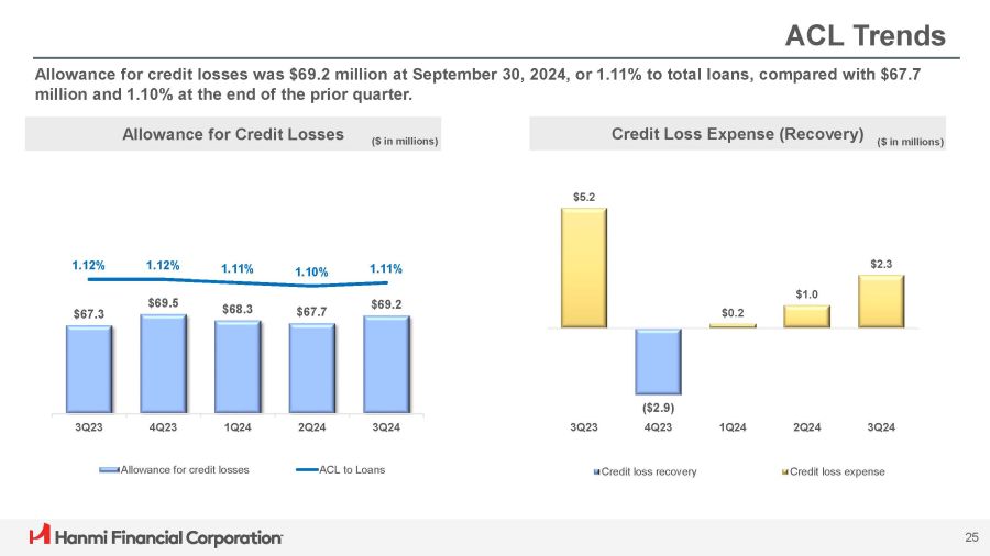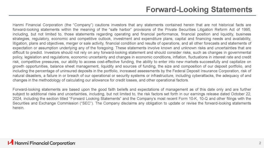 Hanmi Financial Corporation (the “Company”) cautions investors that any statements contained herein that are not historical facts are forward - looking statements within the meaning of the “safe harbor” provisions of the Private Securities Litigation Reform Act of 1995 , including, but not limited to, those statements regarding operating and financial performance, financial position and liquidity, business strategies, regulatory, economic and competitive outlook, investment and expenditure plans, capital and financing needs and availability, litigation, plans and objectives, merger or sale activity, financial condition and results of operations, and all other forecasts and statements of expectation or assumption underlying any of the foregoing . These statements involve known and unknown risks and uncertainties that are difficult to predict . Investors should not rely on any forward - looking statement and should consider risks, such as changes in governmental policy, legislation and regulations, economic uncertainty and changes in economic conditions, inflation, fluctuations in interest rate and credit risk, competitive pressures, our ability to access cost - effective funding, the ability to enter into new markets successfully and capitalize on growth opportunities, balance sheet management, liquidity and sources of funding, the size and composition of our deposit portfolio, and including the percentage of uninsured deposits in the portfolio, increased assessments by the Federal Deposit Insurance Corporation, risk of natural disasters, a failure in or breach of our operational or security systems or infrastructure, including cyberattacks, the adequacy of and changes in the methodology of calculating our allowance for credit losses, and other operational factors . Forward - looking statements are based upon the good faith beliefs and expectations of management as of this date only and are further subject to additional risks and uncertainties, including, but not limited to, the risk factors set forth in our earnings release dated October 22 , 2024 , including the section titled “Forward Looking Statements” and the Company’s most recent Form 10 - K, 10 - Q and other filings with the Securities and Exchange Commission (“SEC”) . The Company disclaims any obligation to update or revise the forward - looking statements herein . 2 Forward - Looking Statements