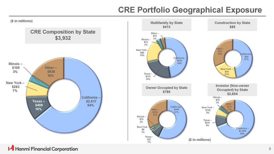 Loan Portfolio Diversification Loan portfolio is well diversified across collateral and industry types; CRE represents 63% of the total portfolio and C&I, excluding Equipment Finance Agreements, represents 14%. CRE Portfolio (1) $3,932M C&I Portfolio (2) $879M Retail – 28% Hospitality – 21% Office – 15% Industrial – 10% Multifamily – 10% Gas Station – 6% Mixed Use – 3% Construction – 2% Other – 5% Manufacturing - 27% 7 Finance & Insurance - 15% Retail Trade - 7% Wholesale Trade - 5% 5% Real Estate Rental & Leasing - Healthcare - 3% Other - 38% (1) $108.0 million, or 2.7%, of the CRE portfolio are unguaranteed SBA loans (2) $50.3 million, or 5.7%, and $45.7 million, or 5.2%, of the C&I portfolio are unguaranteed and guaranteed SBA loans, respectively
