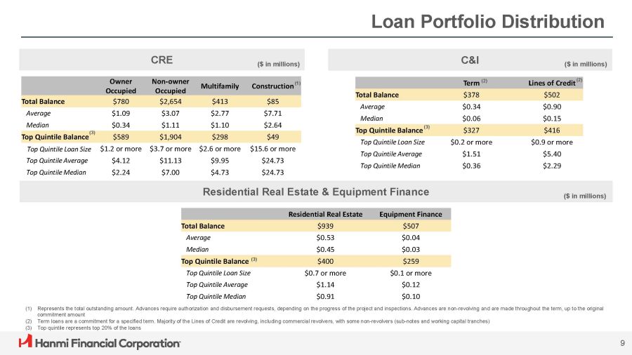 CRE Portfolio Geographical Exposure CRE Composition by State $3,932 Multifamily by State $413 Construction by State $85 Owner Occupied by State $780 Investor (Non - owner Occupied) by State $2,654 California – $2,517 64% Texas – $409 10% New York – $263 7% Illinois – $105 3% Other – $638 16% California – $203 49% Texas – $101 24% New York – $80 19% Illinois – $14 3% Other – $15 5% California – $40 47% New York – $18 21% Other – $27 32% California – $446 57% New York – $8 1% Texas – $57 7% Illinois – $14 2% Other – $255 33% California – $1,828 69% 8 Texas – $251 9% New York – $156 6% Illinois – $78 3% Other – $341 13% ($ in millions) ($ in millions)