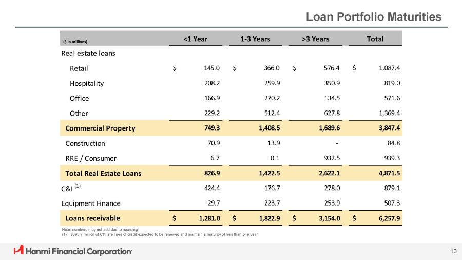 Loan Portfolio Distribution CRE C&I ($ in millions) ($ in millions) Construction (1) Multifamily Non - owner Occupied Owner Occupied $85 $413 $2,654 $780 Total Balance $7.71 $2.77 $3.07 $1.09 Average $2.64 $1.10 $1.11 $0.34 Median $49 $298 $1,904 $589 (3) Top Quintile Balance $15.6 or more $2.6 or more $3.7 or more $1.2 or more Top Quintile Loan Size $24.73 $9.95 $11.13 $4.12 Top Quintile Average $24.73 $4.73 $7.00 $2.24 Top Quintile Median Lines of Credit (2) Term (2) $502 $378 Total Balance $0.90 $0.34 Average $0.15 $0.06 Median $416 $327 (3) Top Quintile Balance $0.9 or more $0.2 or more Top Quintile Loan Size $5.40 $1.51 Top Quintile Average $2.29 $0.36 Top Quintile Median Residential Real Estate & Equipment Finance 9 Equipment Finance Residential Real Estate $507 $939 Total Balance $0.04 $0.53 Average $0.03 $0.45 Median $259 $400 Top Quintile Balance (3) $0.1 or more $0.7 or more Top Quintile Loan Size $0.12 $1.14 Top Quintile Average $0.10 $0.91 Top Quintile Median ($ in millions) (1) Represents the total outstanding amount. Advances require authorization and disbursement requests, depending on the progress of the project and inspections. Advances are non - revolving and are made throughout the term, up to the original commitment amount (2) Term loans are a commitment for a specified term. Majority of the Lines of Credit are revolving, including commercial revolvers, with some non - revolvers (sub - notes and working capital tranches) (3) Top quintile represents top 20% of the loans