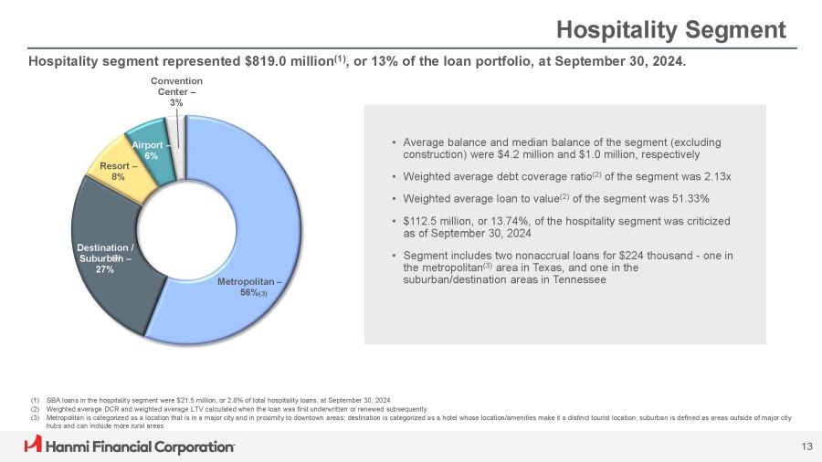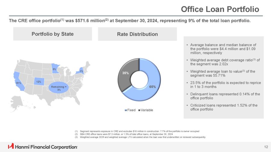 Office Loan Portfolio The CRE office portfolio (1) was $571.6 million (2) at September 30, 2024, representing 9% of the total loan portfolio. 81% 12% 3% Remaining = 3% 1% Portfolio by State • Average balance and median balance of the portfolio were $ 4 . 4 million and $ 1 . 09 million, respectively • Weighted average debt coverage ratio (3) of the segment was 2.02x • Weighted average loan to value (3) of the segment was 55.71% • 23.5% of the portfolio is expected to reprice in 1 to 3 months • Delinquent loans represented 0.14% of the office portfolio • Criticized loans represented 1.52% of the office portfolio Rate Distribution (1) Segment represents exposure in CRE and excludes $18 million in construction. 7.7% of the portfolio is owner occupied (2) SBA CRE office loans were $7.3 million, or 1.3% of total office loans, at September 30, 2024 (3) Weighted average DCR and weighted average LTV calculated when the loan was first underwritten or renewed subsequently 65% 35% Fixed Variable 12