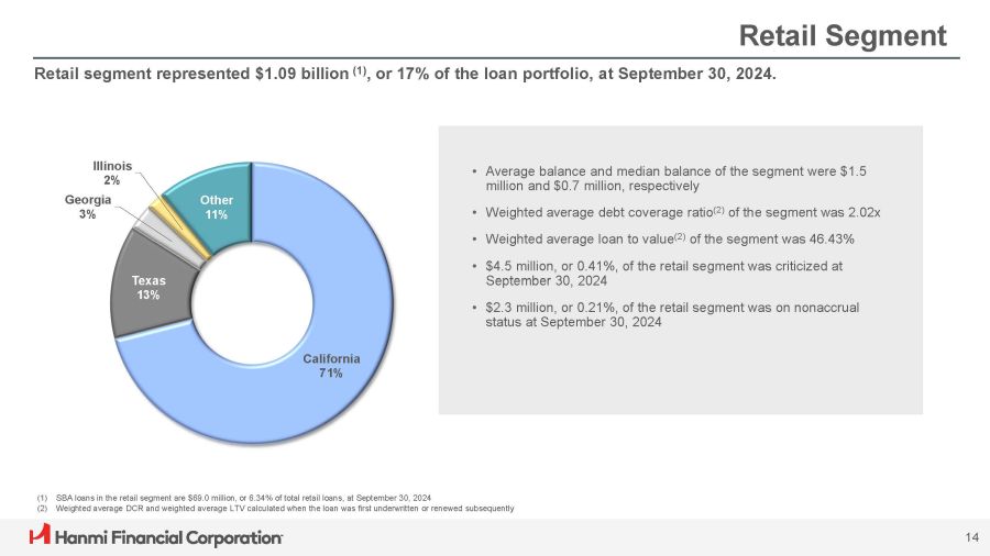 Retail Segment Retail segment represented $1.09 billion (1) , or 17% of the loan portfolio, at September 30, 2024. (1) SBA loans in the retail segment are $69.0 million, or 6.34% of total retail loans, at September 30, 2024 (2) Weighted average DCR and weighted average LTV calculated when the loan was first underwritten or renewed subsequently • Average balance and median balance of the segment were $1.5 million and $0.7 million, respectively • Weighted average debt coverage ratio (2) of the segment was 2.02x • Weighted average loan to value (2) of the segment was 46.43% • $4.5 million, or 0.41%, of the retail segment was criticized at September 30, 2024 • $2.3 million, or 0.21%, of the retail segment was on nonaccrual status at September 30, 2024 California 71% 14 Texas 13% Illinois 2% Georgia 3% Other 11%