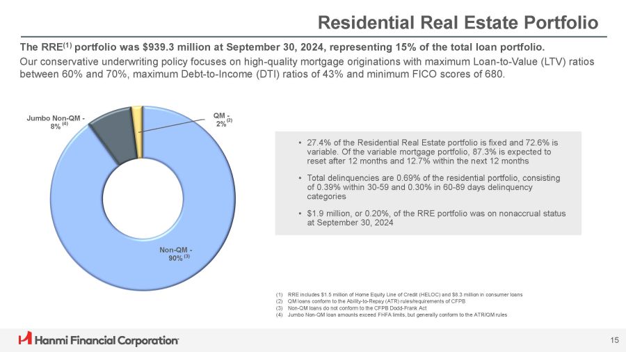 Residential Real Estate Portfolio QM - 2% (2) 15 Non - QM - 90% (3) Jumbo Non - QM - 8% (4) The RRE (1) portfolio was $939.3 million at September 30, 2024, representing 15% of the total loan portfolio. Our conservative underwriting policy focuses on high - quality mortgage originations with maximum Loan - to - Value (LTV) ratios between 60% and 70%, maximum Debt - to - Income (DTI) ratios of 43% and minimum FICO scores of 680. (1) RRE includes $1.5 million of Home Equity Line of Credit (HELOC) and $8.3 million in consumer loans (2) QM loans conform to the Ability - to - Repay (ATR) rules/requirements of CFPB (3) Non - QM loans do not conform to the CFPB Dodd - Frank Act (4) Jumbo Non - QM loan amounts exceed FHFA limits, but generally conform to the ATR/QM rules • 27.4% of the Residential Real Estate portfolio is fixed and 72.6% is variable. Of the variable mortgage portfolio, 87.3% is expected to reset after 12 months and 12.7% within the next 12 months • Total delinquencies are 0.69% of the residential portfolio, consisting of 0.39% within 30 - 59 and 0.30% in 60 - 89 days delinquency categories • $1.9 million, or 0.20%, of the RRE portfolio was on nonaccrual status at September 30, 2024