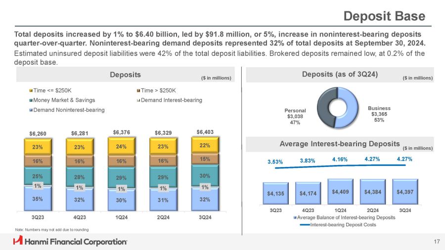 3.53% 3.83% 4.16% 4.27% 4.27% $4,135 $4,174 $4,409 $4,384 $4,397 4Q23 1Q24 2Q24 Average Balance of Interest - bearing Deposits Interest - bearing Deposit Costs 3Q23 3Q24 Deposit Base Total deposits increased by 1% to $6.40 billion, led by $91.8 million, or 5%, increase in noninterest - bearing deposits quarter - over - quarter. Noninterest - bearing demand deposits represented 32% of total deposits at September 30, 2024. Estimated uninsured deposit liabilities were 42% of the total deposit liabilities. Brokered deposits remained low, at 0.2% of the deposit base. 3Q23 4Q23 Note: Numbers may not add due to rounding Deposits Deposits (as of 3Q24) ($ in millions) ($ in millions) Average Interest - bearing Deposits Business $3,365 53% Personal $3,038 47% ($ in millions) 35% 32% 30% 31% 32% 1% 1% 1% 1% 1% 25% 28% 29% 29% 30% 16% 16% 16% 16% 15% 23% 23% 24% 23% 22% $6,260 $6,281 $6,376 $6,329 $6,403 1Q24 2Q24 3Q24 Time <= $250K Money Market & Savings Demand Noninterest - bearing Time > $250K Demand Interest - bearing 17
