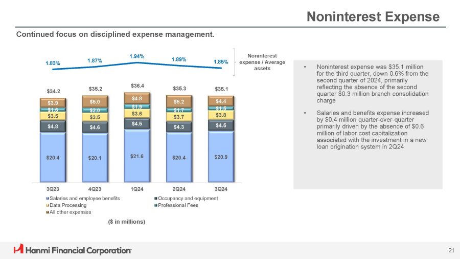 35% $2.3 12% 19% $0.8 $1.3 5% $0.3 29% $1.9 Service charges on deposit accounts Trade finance and other service charges and fees Servicing income Bank - owned life insurance All other operating income Noninterest Income SBA 7(a) Loan Production and Sales ($ in millions) $36.1 $48.4 $30.8 $54.5 $51.6 $21.0 $29.9 $25.6 $23.5 $23.0 6.84% 6.17% 7.23% 8.54% 8.54% 3Q23 4Q23 1Q24 SBA Loan Sales SBA Production 2Q24 3Q24 SBA Trade Premium Noninterest income for the third quarter was $8.4 million, up 5% from the previous quarter. Noninterest Income 3Q24 Service Charges and Fees ($ in millions) ($ in millions) $5.3 $5.8 $6.1 $6.6 $11.2 $1.2 $6.7 $1.4 $7.7 $0.4 $1.5 $8.1 $0.4 $1.6 $8.4 $0.3 $1.5 3Q23 4Q23 1Q24 2Q24 3Q24 (1) $10.0 Service charges, fees & other Gain on sale of SBA loans Gain of sale of mortgage loans Numbers may not add due to rounding (1) Includes a $4.0 million and $0.9 million gain on sale - and - leaseback of bank premises in 3Q23 and 3Q24, respectively. 20 (1)