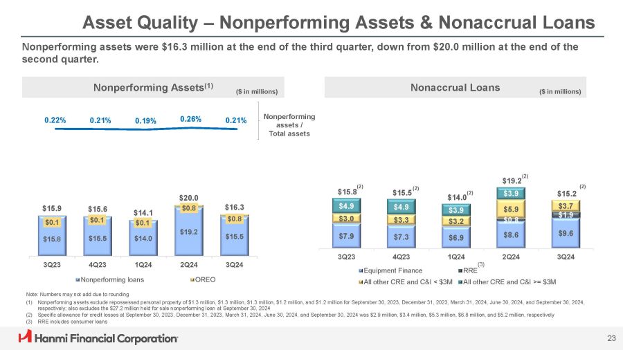 $15.8 $15.5 $14.0 $19.2 $15.5 $0.1 $0.1 $0.1 $15.9 $15.6 $14.1 $20.0 3Q23 4Q23 1Q24 Nonperforming loans 2Q24 3Q24 OREO Asset Quality – Nonperforming Assets & Nonaccrual Loans 0.22% 0.21% 0.19% 0.26% 0.21% Nonperforming assets / Total assets Nonperforming Assets (1) Nonaccrual Loans Nonperforming assets were $16.3 million at the end of the third quarter, down from $20.0 million at the end of the second quarter. ($ in millions) ($ in millions) Note: Numbers may not add due to rounding (1) Nonperforming assets exclude repossessed personal property of $1.3 million, $1.3 million, $1.3 million, $1.2 million, and $1.2 million for September 30, 2023, December 31, 2023, March 31, 2024, June 30, 2024, and September 30, 2024, respectively; also excludes the $27.2 million held for sale nonperforming loan at September 30, 2024 (2) Specific allowance for credit losses at September 30, 2023, December 31, 2023, March 31, 2024, June 30, 2024, and September 30, 2024 was $2.9 million, $3.4 million, $5.3 million, $6.8 million, and $5.2 million, respectively (3) RRE includes consumer loans $7.9 $7.3 $6.9 $8.6 $9.6 $4.9 $4.9 $16.3 $0.8 $3.3 $3.0 $0.8 $15.8 $15.5 $15.2 $3.7 $1.9 $3.9 (2) $14.0 $5.9 $3.9 $0.8 $3.2 $19.2 3Q23 4Q23 Equipment Finance 1Q24 2Q24 3Q24 RRE All other CRE and C&I < $3M All other CRE and C&I >= $3M 23 (3) (2) (2) (2) (2)