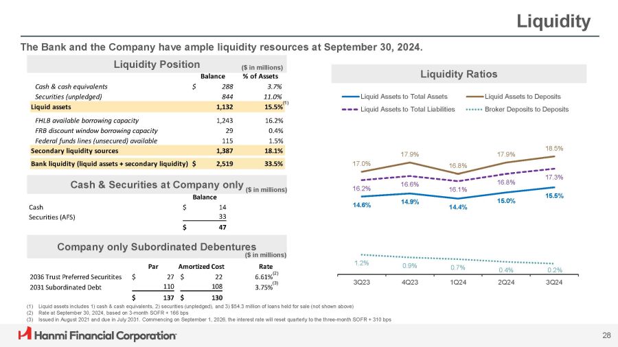 Balance % of Assets FHLB available borrowing capacity FRB discount window borrowing capacity Federal funds lines (unsecured) available 1,243 29 115 16.2% 0.4% 1.5% Secondary liquidity sources 1,387 18.1% Bank liquidity (liquid assets + secondary liquidity) $ 2,519 33.5% Liquidity The Bank and the Company have ample liquidity resources at September 30, 2024. (1) Liquid assets includes 1) cash & cash equivalents, 2) securities (unpledged), and 3) $54.3 million of loans held for sale (not shown above) (2) Rate at September 30, 2024, based on 3 - month SOFR + 166 bps (3) Issued in August 2021 and due in July 2031. Commencing on September 1, 2026, the interest rate will reset quarterly to the three - month SOFR + 310 bps Liquidity Position ($ in millions) 14.6% 14.9% 14.4% 15.0% 15.5% 17.0% 17.9% 16.8% 17.9% 18.5% 16.2% 16.6% 16.1% 16.8% 17.3% 1.2% 0.9% 0.7% 0.4% 0.2% 3Q23 4Q23 1Q24 2Q24 3Q24 3.7% $ 288 Cash & cash equivalents Liquid Assets to Deposits Liquid Assets to Total Assets 11.0% 844 Securities (unpledged) 1) Liquid Assets to Total Liabilities Broker Deposits to Deposits ( Liquid assets 1,132 15.5% Liquidity Ratios 28 Rate (2) 6.61% (3) 3.75% Amortized Cost $ 22 108 Par $ 27 110 2036 Trust Preferred Securitites 2031 Subordinated Debt $ 130 $ 137 Company only Subordinated Debentures ($ in millions) Cash & Securities at Company only ($ in millions) Balance Cash $ 14 Securities (AFS) 33 $ 47