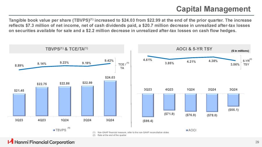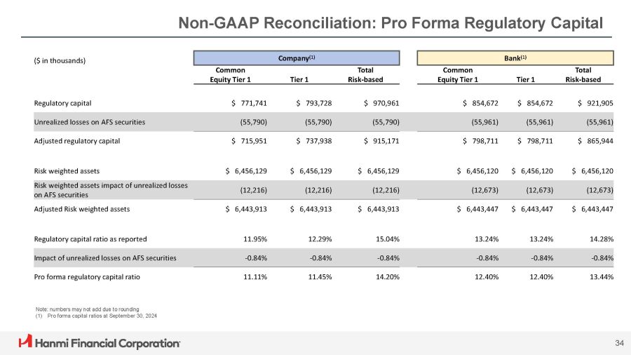 Non - GAAP Reconciliation: Tangible Common Equity to Tangible Asset Ratio 33 (1) There were no preferred shares outstanding at the periods indicated September 30, December 31, March 31, June 30, September 30, ($ in thousands, except per share data) 2023 2023 2024 2024 2024 Hanmi Financial Corporation $ 7,350,140 $ 7,570,341 $ 7,512,046 $ 7,586,347 $ 7,712,299 Assets (11,131) (11,099) (11,074) (11,048) (11,031) Less goodwill and other intangible assets $ 7,339,009 $ 7,559,242 $ 7,500,972 $ 7,575,299 $ 7,701,268 Tangible assets $ 663,359 $ 701,891 $ 703,100 $ 707,059 $ 736,709 Stockholders' equity (1) (11,131) (11,099) (11,074) (11,048) (11,031) Less goodwill and other intangible assets $ 652,228 $ 690,792 $ 692,026 $ 696,011 $ 725,678 Tangible stockholders' equity (1) 9.03% 9.27% 9.36% 9.32% 9.55% Stockholders' equity to assets 8.89% 9.14% 9.23% 9.19% 9.42% Tangible common equity to tangible assets (1) 30,410,582 30,368,655 30,276,358 30,272,110 30,196,755 Common shares outstanding $ 21.45 $ 22.75 $ 22.86 $ 22.99 $ 24.03 Tangible common equity per common share