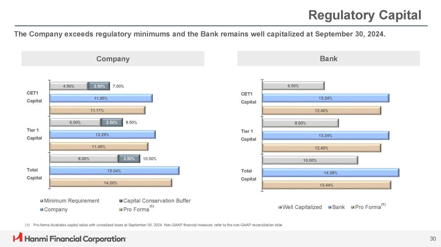 Regulatory Capital The Company exceeds regulatory minimums and the Bank remains well capitalized at September 30, 2024. 8.00% 6.00% 4.50% 2.50% 2.50% 2.50% 15.04% 12.29% 11.95% 14.20% 11.45% 11.11% 10.50% 8.50% 7.00% Minimum Requirement Capital Conservation Buffer Company Pro Forma 10.00% 8.00% 6.50% 14.28% 13.24% 13.24% 13.44% 12.40% 12.40% Well Capitalized Bank Pro Forma (1) 30 CET1 Capital Tier 1 Capital Total Capital Company Bank CET1 Capital Tier 1 Capital Total Capital (1) Pro forma illustrates capital ratios with unrealized loses at September 30, 2024. Non - GAAP financial measure; refer to the non - GAAP reconciliation slide (1)