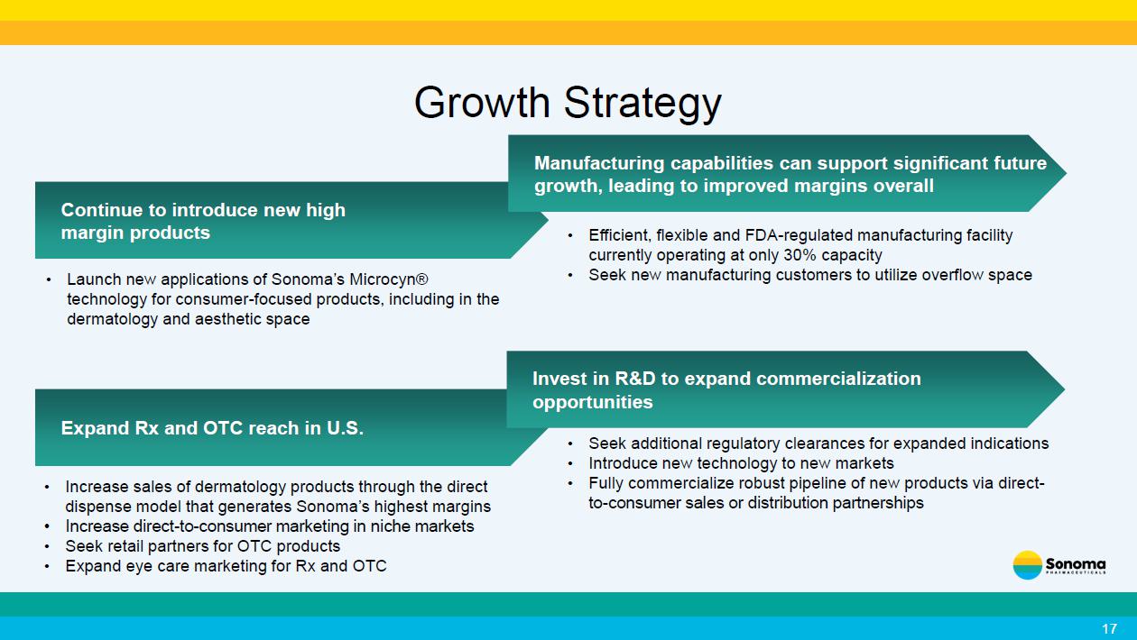 New Market Opportunities Sonoma is expanding its partnerships and product offerings in the eye care, all - natural skin care, medical spa and animal health care industries. • The global eye care market size was estimated at USD $70.78 billion in 2023 and is projected to grow at a compound annual growth rate (CAGR) of 6.72% from 2024 to 2030. 1 • The global natural skin care products market size was valued at $6.7 billion in 2021 and is expected to expand at a CAGR of 6.6% from 2022 to 2030. 2 • The global medical spa market size was estimated at USD 18.6 billion in 2023 and is expected to grow at a CAGR of 15.13% from 2024 to 2030. 3 o North America dominated the medical spa market with a share of 41.1% in 2023, due to higher expenditure on wellness tourism than other regions. 4 • The global animal health market size was valued at USD 62.40 billion in 2023 and is projected to grow at a CAGRof 9.0% from 2024 to 2030. 5 1. Grand View Research, Eye Care Market Report, 2024 - 2030 , available at https ://www.grandviewresearch.com/industry - analysis/eye - care - market - report 2. Grand View Research, Natural Skin Care Products Market Report, 2022 - 2030 , available at https ://www.grandviewresearch.com/industry - analysis/natural - skin - care - products - market 3. Grand View Research, Medical Spa Market Size, Share & Growth Analysis Report 2024 - 2030 , available at https ://www.grandviewresearch.com/industry - analysis/medical - spa - market 4. Ibid. 5. Grand View Research, Animal Health Market Size & Share Report, 2024 - 2030 , available at https ://www.grandviewresearch.com/industry - analysis/animal - health - market 18
