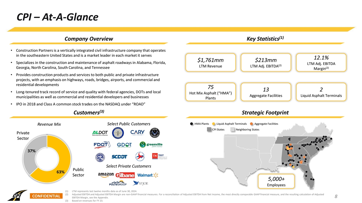 CPI – At-A-Glance (1) Company Overview Key Statistics • Construction Partners is a vertically integrated civil infrastructure company that operates in the southeastern United States and is a market leader in each market it serves 12.1% $1,761mm $213mm • Specializes in the construction and maintenance of asphalt roadways in Alabama, Florida, LTM Adj. EBITDA (2) LTM Revenue LTM Adj. EBITDA Georgia, North Carolina, South Carolina, and Tennessee (2) Margin • Provides construction products and services to both public and private infrastructure projects, with an emphasis on highways, roads, bridges, airports, and commercial and residential developments 75 13 2 • Long-tenured track record of service and quality with federal agencies, DOTs and local Hot Mix Asphalt (“HMA”) Aggregate Facilities Liquid Asphalt Terminals municipalities as well as commercial and residential developers and businesses Plants • IPO in 2018 and Class A common stock trades on the NASDAQ under “ROAD” (3) Customers Strategic Footprint HMA Plants Liquid Asphalt Terminals Aggregate Facilities Select Public Customers Revenue Mix CPI States Neighboring States Private Sector 37% Select Private Customers Public 63% Sector 5,000+ Employees (1) LTM represents last twelve months data as of June 30, 2024. (2) Adjusted EBITDA and Adjusted EBITDA Margin are non-GAAP financial measures. For a reconciliation of Adjusted EBITDA from Net Income, the most directly comparable GAAP financial measure, and the resulting calculation of Adjusted CONFIDENTIAL 8 EBITDA Margin, see the Appendix. (3) Based on revenues for FY 23.