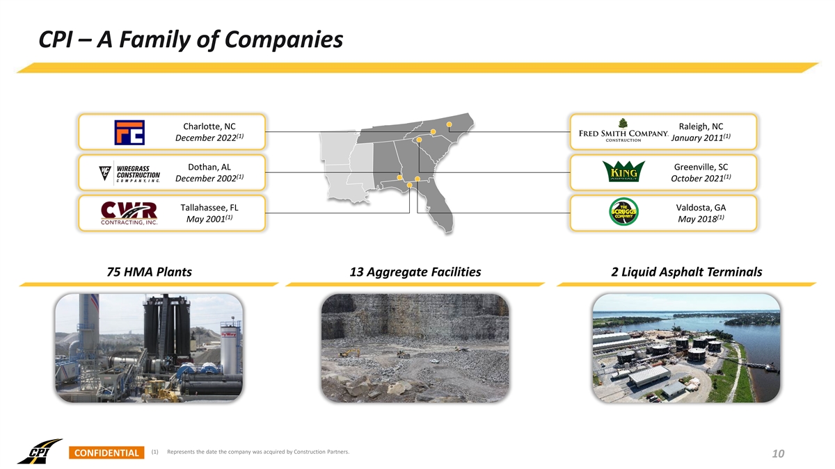 CPI – Highly Integrated Across Value Chain Materials HMA Manufacturing Liquid Asphalt (Sand, Rock, Reclaimed Asphalt Pavement) Bridges & Concrete Misc. Concrete Clearing & Grading Roadway Base HMA Pavement Storm Drainage Structures (curb, gutter, etc.) Signage & Roadway Guardrails, Barriers, Line Striping, Paint, Markers etc. Reflectors, etc. Finished Road CONFIDENTIAL CPI CPI / Other Firm Subcontractor 9 Our Clients Subcontractor Our Services Key Assets