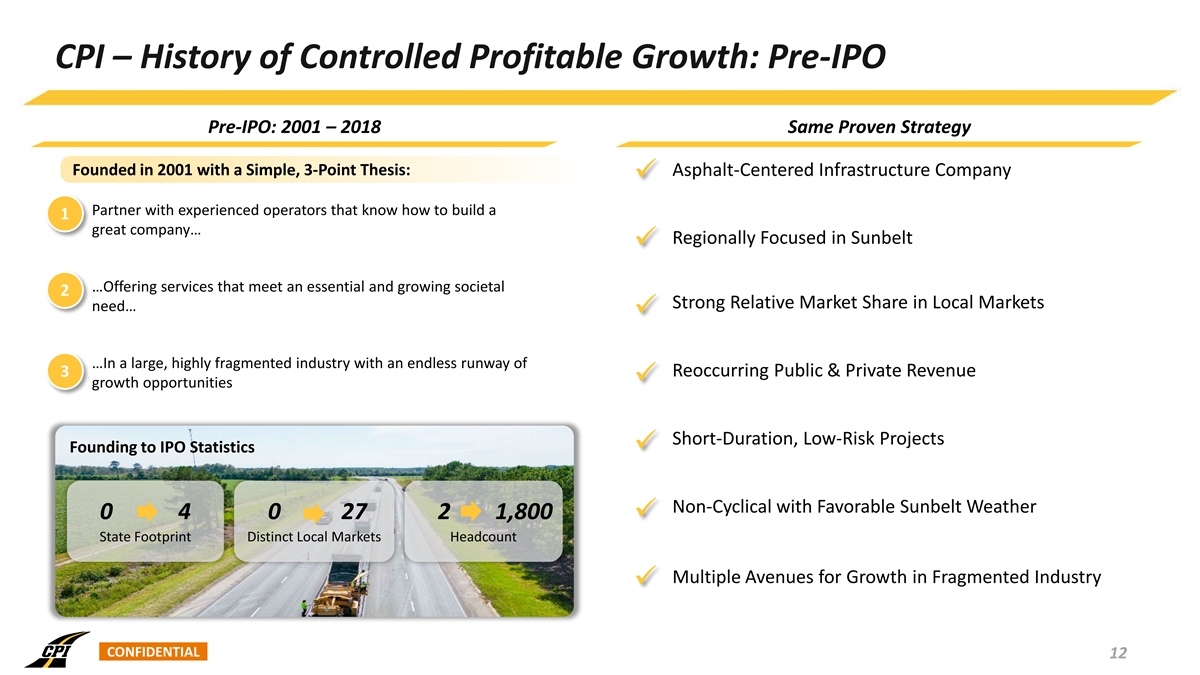 CPI – History of Controlled Profitable Growth: Pre-IPO Pre-IPO: 2001 – 2018 Same Proven Strategy Founded in 2001 with a Simple, 3-Point Thesis: Asphalt-Centered Infrastructure Company ü 1) Partner with experienced operators that know how to build a 1 great company… Regionally Focused in Sunbelt ü 2) …Offering services that meet an essential and growing societal 2 Strong Relative Market Share in Local Markets need… ü 3) …In a large, highly fragmented industry with an endless runway of Reoccurring Public & Private Revenue 3 ü growth opportunities Short-Duration, Low-Risk Projects Founding to IPO Statisticsü Non-Cyclical with Favorable Sunbelt Weather 0 4 0 27 2 1,800 ü State Footprint Distinct Local Markets Headcount Multiple Avenues for Growth in Fragmented Industry ü CONFIDENTIAL 12