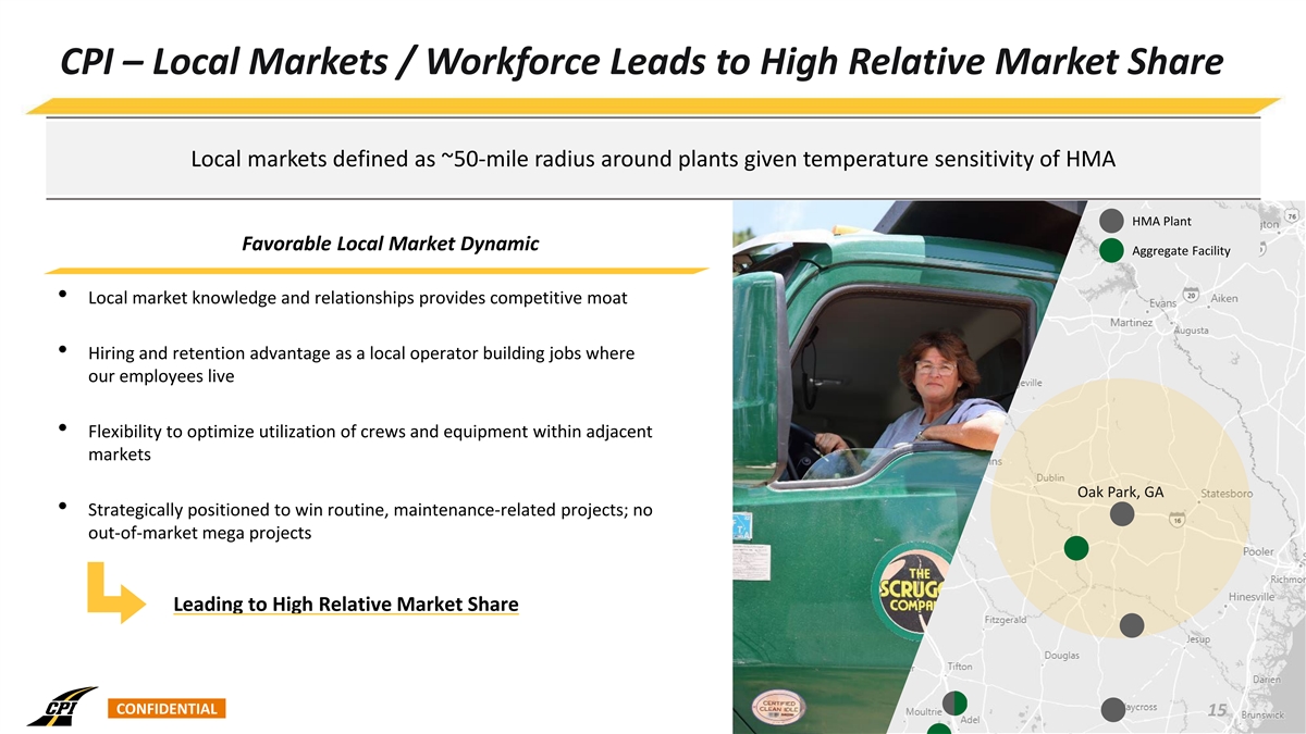 CPI – Local Markets / Workforce Leads to High Relative Market Share Local markets defined as ~50-mile radius around plants given temperature sensitivity of HMA HMA Plant Favorable Local Market Dynamic Aggregate Facility • Local market knowledge and relationships provides competitive moat • Hiring and retention advantage as a local operator building jobs where our employees live • Flexibility to optimize utilization of crews and equipment within adjacent markets Oak Park, GA • Strategically positioned to win routine, maintenance-related projects; no out-of-market mega projects Leading to High Relative Market Share CONFIDENTIAL 15