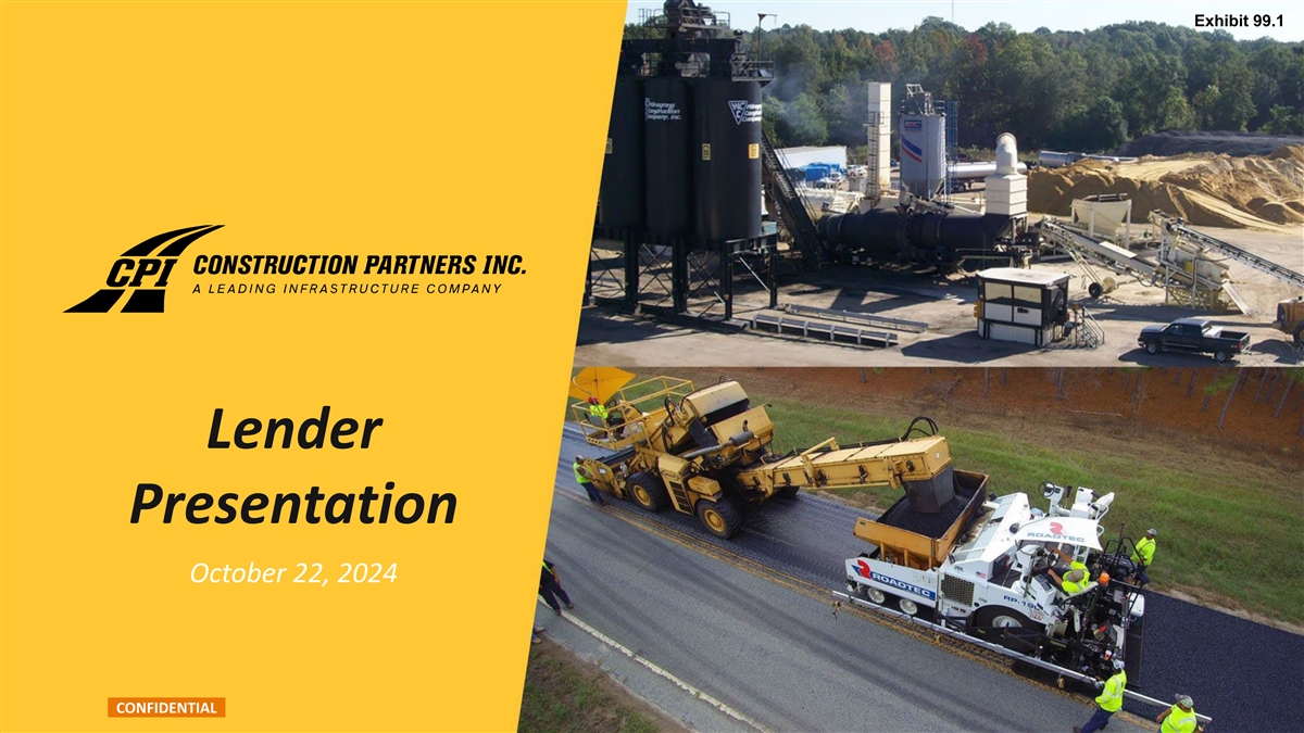 Cautionary Statements About this Presentation The information in this presentation is current only as of the date on its cover. For any time after the cover date of this presentation, the information, including information concerning the business, financial condition, results of operations and prospects of Construction Partners, Inc. (“CPI” or the “Company”), may have changed. The delivery of this presentation shall not, under any circumstances, create any implication that there have been no changes in the Company’s affairs after the date of this presentation. The Company’s fiscal year ends on September 30th of any given year, and the fiscal year of Asphalt Inc., LLC d/b/a Lone Star Paving (“LSP”) has historically ended on December 31st of any given year. Any reference in this presentation to a fiscal year refers to the fiscal year ended September 30th of that year, unless otherwise noted. The Company has not authorized any person to give any information or to make any representations about the Company in connection with this presentation that are not contained herein. If any information has been or is given or any representations have been or are made to you outside of this presentation, such information or representations should not be relied upon as having been authorized by the Company. Forward-Looking Statements Certain statements contained herein relating to the Company or LSP that are not statements of historical or current fact constitute “forward-looking statements” within the meaning of Section 27A of the Securities Act of 1933, as amended (the “Securities Act”), and Section 21E of the Securities Exchange Act of 1934, as amended. These statements may be identified by the use of words such as “seek,” “continue,” “estimate,” “predict,” “potential,” “targeting,” “could,” “might,” “may,” “will,” “expect,” “should,” “anticipate,” “intend,” “project,” “outlook,” “believe,” “plan” and similar expressions or their negative. These forward- looking statements include, among others, statements regarding the anticipated timing of closing the Company’s acquisition of LSP; estimates of future synergies, savings and efficiencies relating to the Company’s acquisition of LSP; expectations regarding the Company’s ability to effectively integrate assets and properties it may acquire as a result of the Company’s acquisition of LSP; expectations of future plans, priorities, focuses, and benefits of the Company’s acquisition of LSP; expectations regarding the Company’s ability to obtain financing in connection with its acquisition of LSP; and statements regarding the expected financial performance of the Company following its acquisition of LSP, including statements regarding the Company’s expected Revenue, Net Income, Adjusted EBITDA and Adjusted EBITDA Margin for the fiscal year ended September 30, 2024. Important factors that could cause actual results to differ materially from those expressed in the forward-looking statements, include, among others, the ability of the parties to consummate the acquisition of LSP in a timely manner, or at all; satisfaction of any conditions precedent to the consummation of the Company’s acquisition of LSP, including the ability to obtain required regulatory approvals in a timely manner, or at all; the Company’s ability to obtain financing to fund its acquisition of LSP on favorable terms, or at all; failure to realize the anticipated benefits of the Company’s acquisition of LSP; the preliminary financial information remaining subject to changes and finalization based upon management’s ongoing review of results for the fiscal year ended September 30, 2024 and the completion of all year-end closing procedures; and the other risks, uncertainties and factors set forth in the Company’s most recent Annual Report on Form 10-K, its subsequent Quarterly Reports on Form 10-Q, its Current Reports on Form 8-K and other reports the Company files with the Securities and Exchange Commission (the “SEC”). Forward-looking statements speak only as of the date they are made. The Company assumes no obligation to update forward-looking statements to reflect actual results, subsequent events, or circumstances or other changes affecting such statements, except to the extent required by applicable law. Use of Non-GAAP Financial Information The Company presents Adjusted EBITDA, Adjusted EBTIDA Margin, Free Cash Flow Conversion, Total Leverage Ratio and Net Leverage Ratio to help the Company describe its operating and financial performance. These financial measures do not conform to accounting principles generally accepted in the United States ( GAAP ), are commonly used in the Company’s industry and have certain limitations and should not be construed as alternatives to Net Income and other income data measures (as determined in accordance with GAAP), or as better indicators of operating performance. These non-GAAP financial measures, as defined by the Company, may not be comparable to similar non-GAAP financial measures presented by other companies. The Company’s presentation of such measures should not be construed as an inference that its future results will be unaffected by unusual or non-recurring items. For additional information regarding the Company's use of non-GAAP financial information, as well as reconciliations of non-GAAP financial measures to the most directly comparable financial measures calculated and presented in accordance with GAAP, please see the appendix to this presentation. Preliminary Financial Results This presentation includes certain preliminary financial information regarding the Company’s fiscal year ended September 30, 2024. The Company’s independent registered public accounting firm has not audited, reviewed, compiled or performed any procedures with respect to such preliminary financial information or its audit of the Company