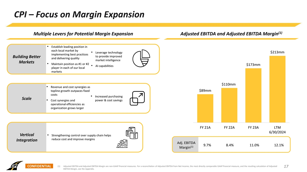 CPI – Focus on Margin Expansion (1) Multiple Levers for Potential Margin Expansion Adjusted EBITDA and Adjusted EBITDA Margin • Establish leading position in each local market by • Leverage technology $213mm implementing best practices to provide improved Building Better and delivering quality market intelligence Markets • Maintain position as #1 or #2 $173mm • AI capabilities player in each of our local markets $110mm • Revenue and cost synergies as topline growth outpaces fixed $89mm costs • Increased purchasing Scale • Cost synergies and power & cost savings operational efficiencies as organization grows larger FY 21A FY 22A FY 23A LTM 6/30/2024 Vertical • Strengthening control over supply chain helps reduce cost and improve margins Integration Adj. EBITDA 9.7% 8.4% 11.0% 12.1% (1) Margin (1) Adjusted EBITDA and Adjusted EBITDA Margin are non-GAAP financial measures. For a reconciliation of Adjusted EBITDA from Net Income, the most directly comparable GAAP financial measure, and the resulting calculation of Adjusted CONFIDENTIAL 17 EBITDA Margin, see the Appendix.