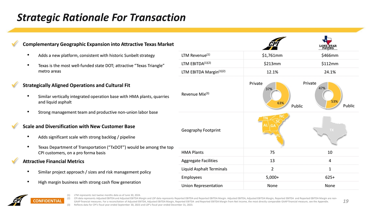 Strategic Rationale For Transaction Complementary Geographic Expansion into Attractive Texas Market ü (1) • Adds a new platform, consistent with historic Sunbelt strategy LTM Revenue $1,761mm $466mm (1)(2) LTM EBITDA $213mm $112mm • Texas is the most well-funded state DOT; attractive “Texas Triangle” (1)(2) metro areas LTM EBITDA Margin 12.1% 24.1% Private Private Strategically Aligned Operations and Cultural Fit ü 47% 37% (3) Revenue Mix • Similar vertically integrated operation base with HMA plants, quarries 53% and liquid asphalt 63% Public Public • Strong management team and productive non-union labor base NC TN SC AL GA Scale and Diversification with New Customer Base ü TX Geography Footprint FL • Adds significant scale with strong backlog / pipeline • Texas Department of Transportation (“TxDOT”) would be among the top HMA Plants 75 10 CPI customers, on a pro forma basis Aggregate Facilities 13 4 Attractive Financial Metrics ü Liquid Asphalt Terminals 2 1 • Similar project approach / sizes and risk management policy Employees 5,000+ 625+ • High margin business with strong cash flow generation Union Representation None None (1) LTM represents last twelve months data as of June 30, 2024. (2) CPI data represents Adjusted EBITDA and Adjusted EBITDA Margin and LSP data represents Reported EBITDA and Reported EBITDA Margin. Adjusted EBITDA, Adjusted EBITDA Margin, Reported EBITDA and Reported EBITDA Margin are non- CONFIDENTIAL GAAP financial measures. For a reconciliation of Adjusted EBITDA, Adjusted EBITDA Margin, Reported EBITDA and Reported EBITDA Margin from Net Income, the most directly comparable GAAP financial measure, see the Appendix. 19 (3) Reflects data for CPI’s fiscal year ended September 30, 2023 and LSP’s fiscal year ended December 31, 2023.