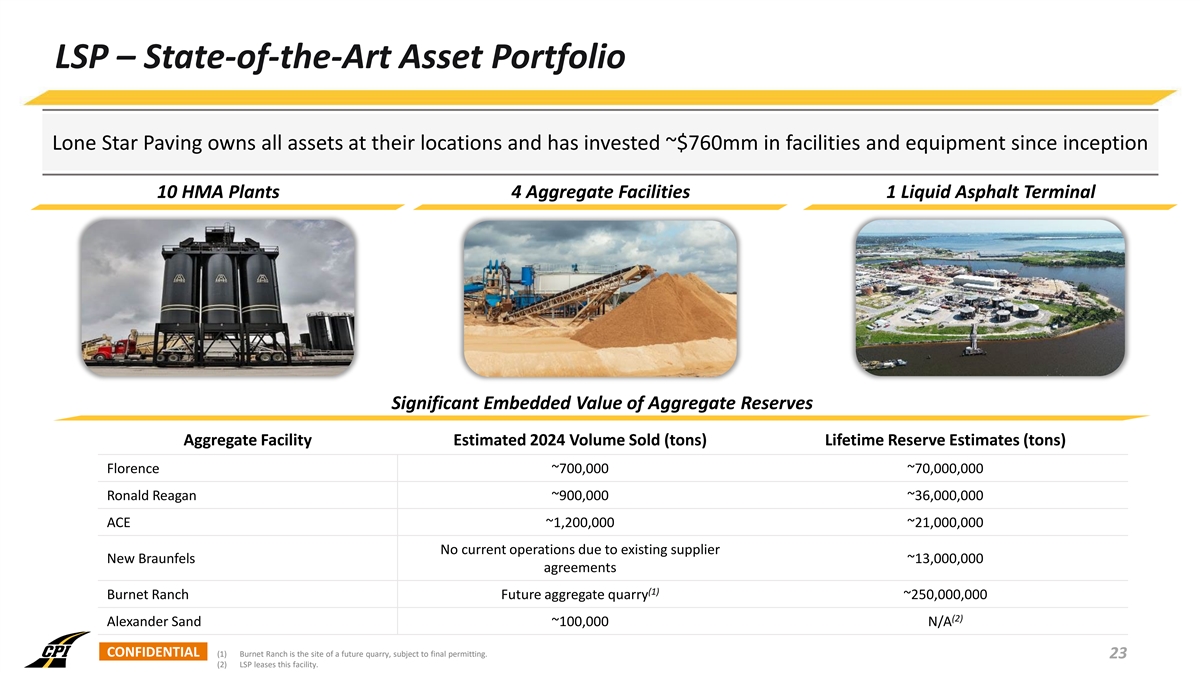 LSP – Company History Strategic acquisitions, significant investments in plants and equipment, and outfitting of new crews have expanded LSP’s geographical footprint and increased vertical integration capabilities • Acquired asphalt milling company • Built Florence HMA plant • Acquired Pinn Road HMA plant Built Leased additional • Acquired three trucking Lone Star Spicewood 286 acres • Acquired Alexander Sand and • Acquired previously leased Paving companies, rolling them into HMA plant at Florence quarry related lease Florence quarry founded one consolidated entity 2014 2015 2016 2017 2018 2019 2020 2021 2022 2023 2024 Built Tesla Road Built Buda • Acquired Centex, Hanson, • Leased 871 acres in • Acquired Ronald Reagan quarry HMA plant HMA plant Mustang Ridge and Ronald Florence • Acquired land at Belton for HMA Reagan HMA plants and th • Acquired 140 acres in plant (11 plant; expected to be paving operations New Braunfels operational in November 2024) • Acquired barge-served, • Built New Braunfels • Acquired land at Burnet Ranch liquid asphalt terminal HMA plant • Acquired additional land in outside Houston Channelview for storage tank expansion CONFIDENTIAL 21