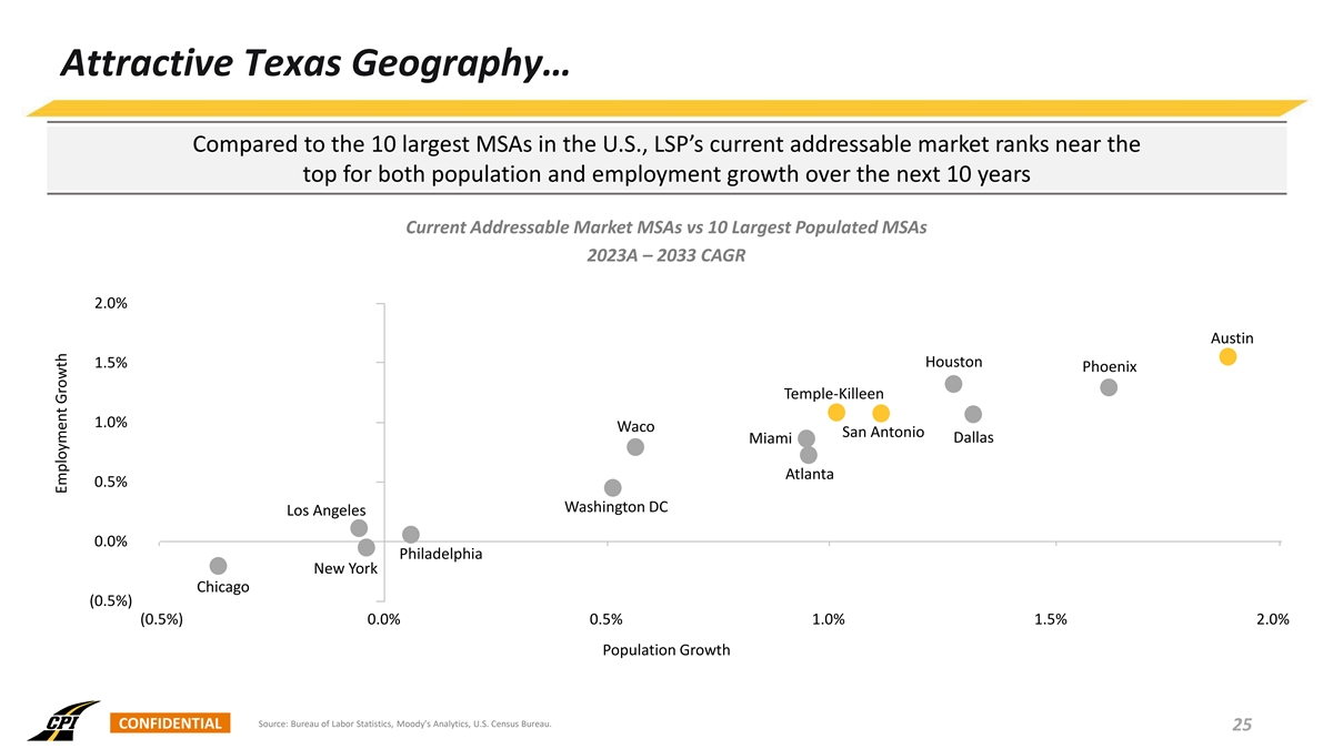 Attractive Texas Geography… Compared to the 10 largest MSAs in the U.S., LSP’s current addressable market ranks near the top for both population and employment growth over the next 10 years Current Addressable Market MSAs vs 10 Largest Populated MSAs 2023A – 2033 CAGR 2.0% Austin 1.5% Houston Phoenix Temple-Killeen 1.0% Waco San Antonio Dallas Miami Atlanta 0.5% Washington DC Los Angeles 0.0% Philadelphia New York Chicago (0.5%) (0.5%) 0.0% 0.5% 1.0% 1.5% 2.0% Population Growth Source: Bureau of Labor Statistics, Moody’s Analytics, U.S. Census Bureau. CONFIDENTIAL 25 Employment Growth