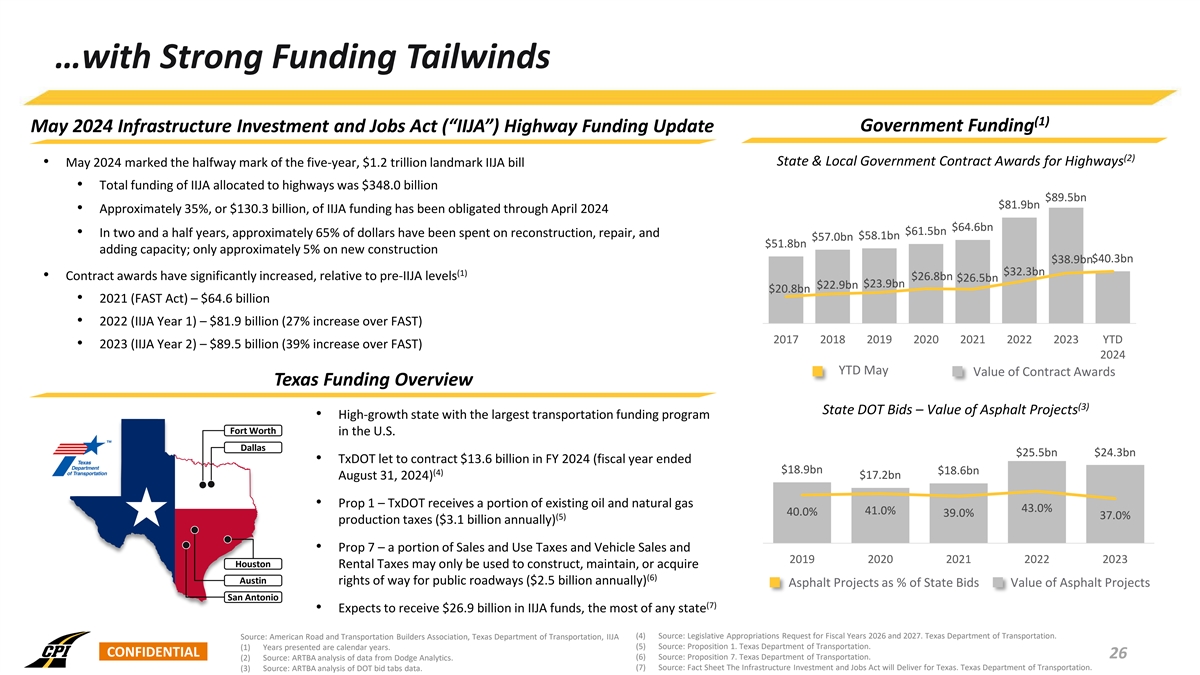 …with Strong Funding Tailwinds (1) Government Funding May 2024 Infrastructure Investment and Jobs Act (“IIJA”) Highway Funding Update (2) State & Local Government Contract Awards for Highways • May 2024 marked the halfway mark of the five-year, $1.2 trillion landmark IIJA bill • Total funding of IIJA allocated to highways was $348.0 billion $89.5bn $81.9bn • Approximately 35%, or $130.3 billion, of IIJA funding has been obligated through April 2024 $64.6bn $61.5bn • In two and a half years, approximately 65% of dollars have been spent on reconstruction, repair, and $58.1bn $57.0bn $51.8bn adding capacity; only approximately 5% on new construction $40.3bn $38.9bn $32.3bn (1) • Contract awards have significantly increased, relative to pre-IIJA levels $26.8bn $26.5bn $23.9bn $22.9bn $20.8bn • 2021 (FAST Act) – $64.6 billion • 2022 (IIJA Year 1) – $81.9 billion (27% increase over FAST) 2017 2018 2019 2020 2021 2022 2023 YTD • 2023 (IIJA Year 2) – $89.5 billion (39% increase over FAST) 2024 YTD May Value of Contract Awards Texas Funding Overview (3) State DOT Bids – Value of Asphalt Projects • High-growth state with the largest transportation funding program Fort Worth in the U.S. Dallas $25.5bn $24.3bn • TxDOT let to contract $13.6 billion in FY 2024 (fiscal year ended $18.9bn (4) $18.6bn $17.2bn August 31, 2024) • Prop 1 – TxDOT receives a portion of existing oil and natural gas 43.0% 41.0% 40.0% 39.0% (5) 37.0% production taxes ($3.1 billion annually) • Prop 7 – a portion of Sales and Use Taxes and Vehicle Sales and 2019 2020 2021 2022 2023 Houston Rental Taxes may only be used to construct, maintain, or acquire (6) Austin rights of way for public roadways ($2.5 billion annually) Asphalt Projects as % of State Bids Value of Asphalt Projects San Antonio (7) • Expects to receive $26.9 billion in IIJA funds, the most of any state (4) Source: Legislative Appropriations Request for Fiscal Years 2026 and 2027. Texas Department of Transportation. Source: American Road and Transportation Builders Association, Texas Department of Transportation, IIJA (5) Source: Proposition 1. Texas Department of Transportation. (1) Years presented are calendar years. CONFIDENTIAL 26 (6) Source: Proposition 7. Texas Department of Transportation. (2) Source: ARTBA analysis of data from Dodge Analytics. (7) Source: Fact Sheet The Infrastructure Investment and Jobs Act will Deliver for Texas. Texas Department of Transportation. (3) Source: ARTBA analysis of DOT bid tabs data.