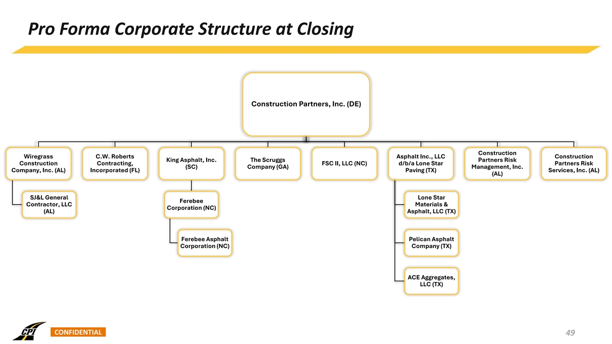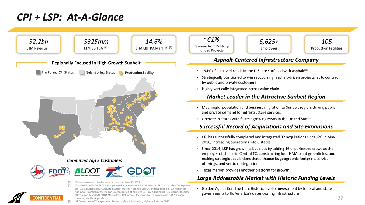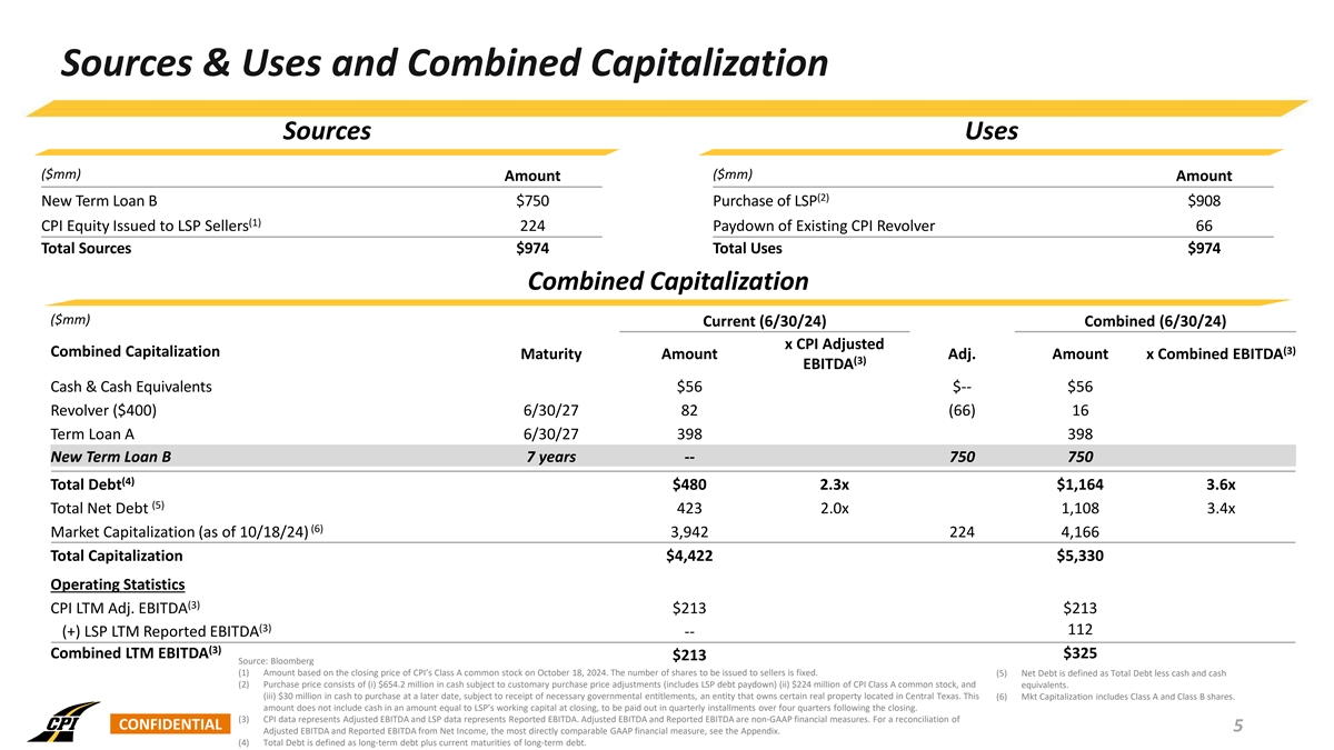 Executive Summary • Construction Partners, Inc. (“CPI” or “Construction Partners”) entered into a Unit Purchase Agreement to acquire all of the outstanding membership units of Asphalt Inc., LLC dba Lone Star Paving (“LSP” or “Lone Star Paving”) on a cash-free, debt-free basis (1) • Aggregate consideration consists of (i) $654.2 million in cash (subject to customary purchase price adjustments), (ii) 3 million shares ($224.1 million ) of CPI Class A common stock to be issued to the sellers and (iii) cash in an amount equal to working capital remaining in Lone Star at the closing, to be paid out in quarterly installments (2) over four quarters following the closing • As a condition to closing, CPI and the sellers will execute a conditional purchase agreement whereby CPI will agree to purchase from the sellers, upon receipt of necessary governmental entitlements, an entity that owns certain real property located in Central Texas for $30 million in cash • Construction Partners is a vertically integrated civil infrastructure company that specializes in the construction and maintenance of roadways across Alabama, Florida, Georgia, North Carolina, South Carolina, and Tennessee (3) • For the last twelve months ended June 30, 2024, CPI generated Revenue and Adjusted EBITDA of $1,761 million and $213 million, respectively • As of June 30, 2024, CPI’s backlog was $1,864 million, representing an approximately 16% increase over the prior year end • Lone Star Paving is a vertically integrated civil infrastructure company that specializes in the construction and maintenance of roadways in the high-growth Central and South regions of Texas (3) • For the last twelve months ended June 30, 2024, LSP generated Revenue and Reported EBITDA of $466 million and $112 million, respectively • As of June 30, 2024, LSP’s backlog was $713 million, representing an approximately 15% increase over the prior year end • Acquisition establishes a new platform company for CPI and an entry into Texas, which boasts the most well-funded Department of Transportation (“DOT”) program in the U.S. combined with strong demographic and economic conditions • Strategically aligned operational focus with vertically integrated approach • CPI is planning to access the institutional debt market to raise $750 million via a First Lien Term Loan B to finance the cash portion of the purchase price and pay down CPI’s existing Revolving Credit Facility (4) (5) • Following consummation of the transaction, CPI will have Total Leverage and Net Leverage of 3.6x and 3.4x , respectively • The transaction closing and timing is subject to customary closing conditions (1) Amount based on the closing price of CPI’s Class A common stock on October 18, 2024. The number of shares to be issued to sellers is fixed (subject to adjustments to avoid the issuance of fractional shares). (2) The amount of these payments is subject to adjustments and offsets to satisfy certain of the sellers’ indemnification obligations and any working capital matters. (3) Adjusted EBITDA and Reported EBITDA are non-GAAP financial measures. For a reconciliation of Adjusted EBITDA and Reported EBITDA from Net Income, the most directly comparable GAAP financial measure, see the Appendix. (4) Total Leverage is equal to Total Debt (CPI and LSP combined) divided by (Adjusted EBITDA (CPI) plus Reported EBITDA (LSP)) for the last twelve months ended June 30, 2024. Total Debt is defined as long-term debt plus current maturities of long-term debt. For a reconciliation of Adjusted EBITDA and Reported EBITDA from Net Income for CPI and LSP, respectively, see the Appendix. CONFIDENTIAL 4 (5) Net Leverage is equal to Net Debt (CPI and LSP combined) divided by (Adjusted EBITDA (CPI) plus Reported EBITDA (LSP)) for the last twelve months ended June 30, 2024. Net Debt is defined as Total Debt less cash and cash equivalents. For a reconciliation of Adjusted EBITDA and Reported EBITDA from Net Income for CPI and LSP, respectively, see the Appendix.