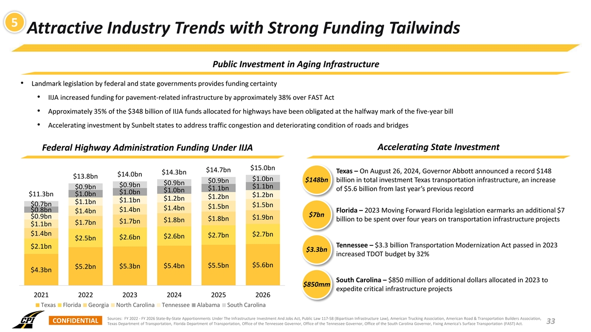 5 Attractive Industry Trends with Strong Funding Tailwinds Public Investment in Aging Infrastructure • Landmark legislation by federal and state governments provides funding certainty • IIJA increased funding for pavement-related infrastructure by approximately 38% over FAST Act • Approximately 35% of the $348 billion of IIJA funds allocated for highways have been obligated at the halfway mark of the five-year bill • Accelerating investment by Sunbelt states to address traffic congestion and deteriorating condition of roads and bridges Accelerating State Investment Federal Highway Administration Funding Under IIJA $15.0bn $14.7bn Texas – On August 26, 2024, Governor Abbott announced a record $148 $14.3bn $14.0bn $13.8bn $1.0bn $148bn billion in total investment Texas transportation infrastructure, an increase $0.9bn $0.9bn $0.9bn $1.1bn $0.9bn $1.1bn of $5.6 billion from last year’s previous record $1.0bn $1.0bn $11.3bn $1.0bn $1.2bn $1.2bn $1.2bn $1.1bn $1.1bn $0.7bn $1.5bn $1.5bn $1.4bn $0.8bn $1.4bn Florida – 2023 Moving Forward Florida legislation earmarks an additional $7 $1.4bn $7bn $0.9bn $1.9bn $1.8bn billion to be spent over four years on transportation infrastructure projects $1.8bn $1.7bn $1.7bn $1.1bn $1.4bn $2.7bn $2.7bn $2.6bn $2.6bn $2.5bn Tennessee – $3.3 billion Transportation Modernization Act passed in 2023 $2.1bn $3.3bn increased TDOT budget by 32% $5.6bn $5.4bn $5.5bn $5.2bn $5.3bn $4.3bn South Carolina – $850 million of additional dollars allocated in 2023 to $850mm expedite critical infrastructure projects 2021 2022 2023 2024 2025 2026 Texas Florida Georgia North Carolina Tennessee Alabama South Carolina Sources: FY 2022 - FY 2026 State-By-State Apportionments Under The Infrastructure Investment And Jobs Act, Public Law 117-58 (Bipartisan Infrastructure Law), American Trucking Association, American Road & Transportation Builders Association, CONFIDENTIAL 33 Texas Department of Transportation, Florida Department of Transportation, Office of the Tennessee Governor, Office of the Tennessee Governor, Office of the South Carolina Governor, Fixing America’s Surface Transportation (FAST) Act.