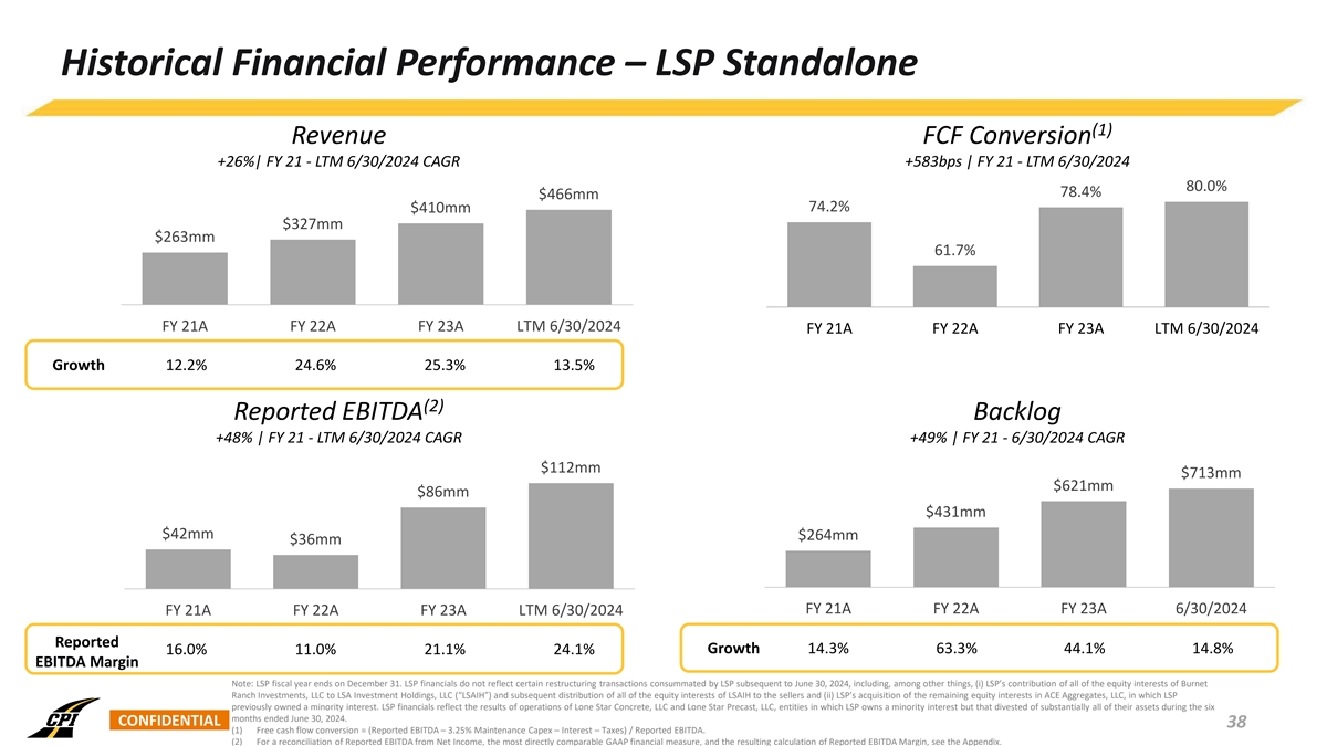 Historical Financial Performance – LSP Standalone (1) Revenue FCF Conversion +26%| FY 21 - LTM 6/30/2024 CAGR +583bps | FY 21 - LTM 6/30/2024 80.0% 78.4% $466mm 74.2% $410mm $327mm $263mm 61.7% FY 21A FY 22A FY 23A LTM 6/30/2024 FY 21A FY 22A FY 23A LTM 6/30/2024 Growth 12.2% 24.6% 25.3% 13.5% (2) Reported EBITDA Backlog +48% | FY 21 - LTM 6/30/2024 CAGR +49% | FY 21 - 6/30/2024 CAGR $112mm $713mm $621mm $86mm $431mm $42mm $264mm $36mm FY 21A FY 22A FY 23A 6/30/2024 FY 21A FY 22A FY 23A LTM 6/30/2024 Reported Growth 14.3% 63.3% 44.1% 14.8% 16.0% 11.0% 21.1% 24.1% EBITDA Margin Note: LSP fiscal year ends on December 31. LSP financials do not reflect certain restructuring transactions consummated by LSP subsequent to June 30, 2024, including, among other things, (i) LSP’s contribution of all of the equity interests of Burnet Ranch Investments, LLC to LSA Investment Holdings, LLC (“LSAIH”) and subsequent distribution of all of the equity interests of LSAIH to the sellers and (ii) LSP’s acquisition of the remaining equity interests in ACE Aggregates, LLC, in which LSP previously owned a minority interest. LSP financials reflect the results of operations of Lone Star Concrete, LLC and Lone Star Precast, LLC, entities in which LSP owns a minority interest but that divested of substantially all of their assets during the six months ended June 30, 2024. CONFIDENTIAL 38 (1) Free cash flow conversion = (Reported EBITDA – 3.25% Maintenance Capex – Interest – Taxes) / Reported EBITDA. (2) For a reconciliation of Reported EBITDA from Net Income, the most directly comparable GAAP financial measure, and the resulting calculation of Reported EBITDA Margin, see the Appendix.