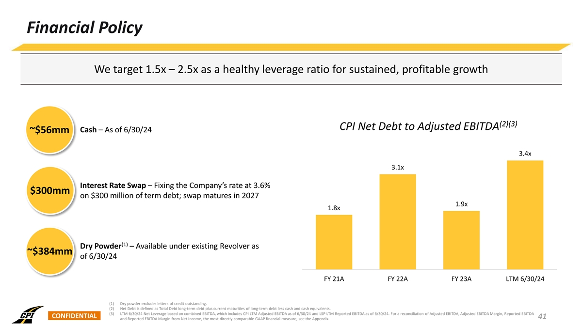 Financial Guidance Outlook / Commentary CPI FY 24 Guidance • Business continues to perform well as we close out FYE 2024 (on FY 24 September 30th) Low High Revenue $1,821mm $1,825mm • Increased funding for public projects continues at the federal, state and local levels Adj. EBITDA $219mm $222mm Adj. EBITDA Margin 12.0% 12.2% • Steady commercial project environment, given strong local macro trends in the states we operate CPI FY 25 Guidance • Continue to effectively execute strategic goals - expanding into new and adjacent markets through both organic growth and acquisitions FY 25 Low High • Enhance our relative market share and achieving margin expansion via our scale and vertical integration Revenue $2,420mm $2,520mm Net Income $90mm $106mm • Stable and sustainable growth trajectory will continue to enhance value Adj. EBITDA $338mm $368mm for all of our stakeholders Adj. EBITDA Margin 14.0% 14.6% • Record fourth quarter despite the significant impacts of Hurricanes Debby, Francine, and Helene in August and September CONFIDENTIAL 40 Note: CPI has a fiscal year end of September 30. For a reconciliation of Adjusted EBITDA and Adjusted EBITDA Margin from Net Income, the most directly comparable GAAP financial measure, see the Appendix.