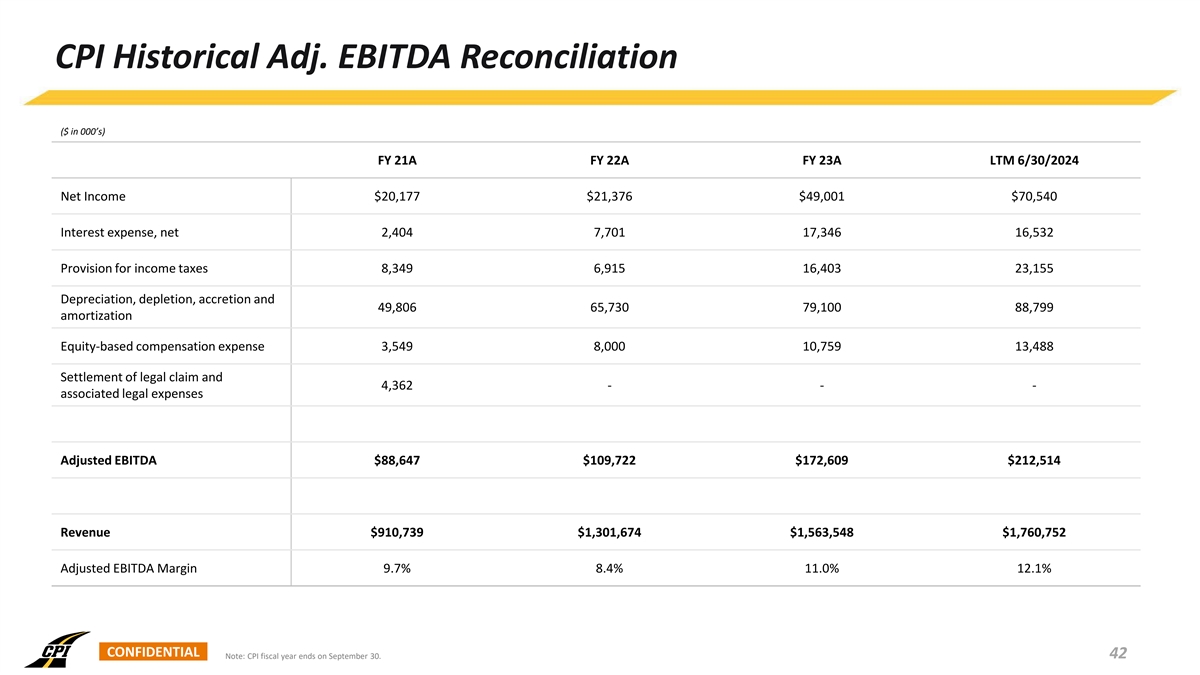 CPI Historical Adj. EBITDA Reconciliation ($ in 000’s) FY 21A FY 22A FY 23A LTM 6/30/2024 Net Income $20,177 $21,376 $49,001 $70,540 Interest expense, net 2,404 7,701 17,346 16,532 Provision for income taxes 8,349 6,915 16,403 23,155 Depreciation, depletion, accretion and 49,806 65,730 79,100 88,799 amortization Equity-based compensation expense 3,549 8,000 10,759 13,488 Settlement of legal claim and 4,362 - - - associated legal expenses Adjusted EBITDA $88,647 $109,722 $172,609 $212,514 Revenue $910,739 $1,301,674 $1,563,548 $1,760,752 Adjusted EBITDA Margin 9.7% 8.4% 11.0% 12.1% CONFIDENTIAL Note: CPI fiscal year ends on September 30. 42