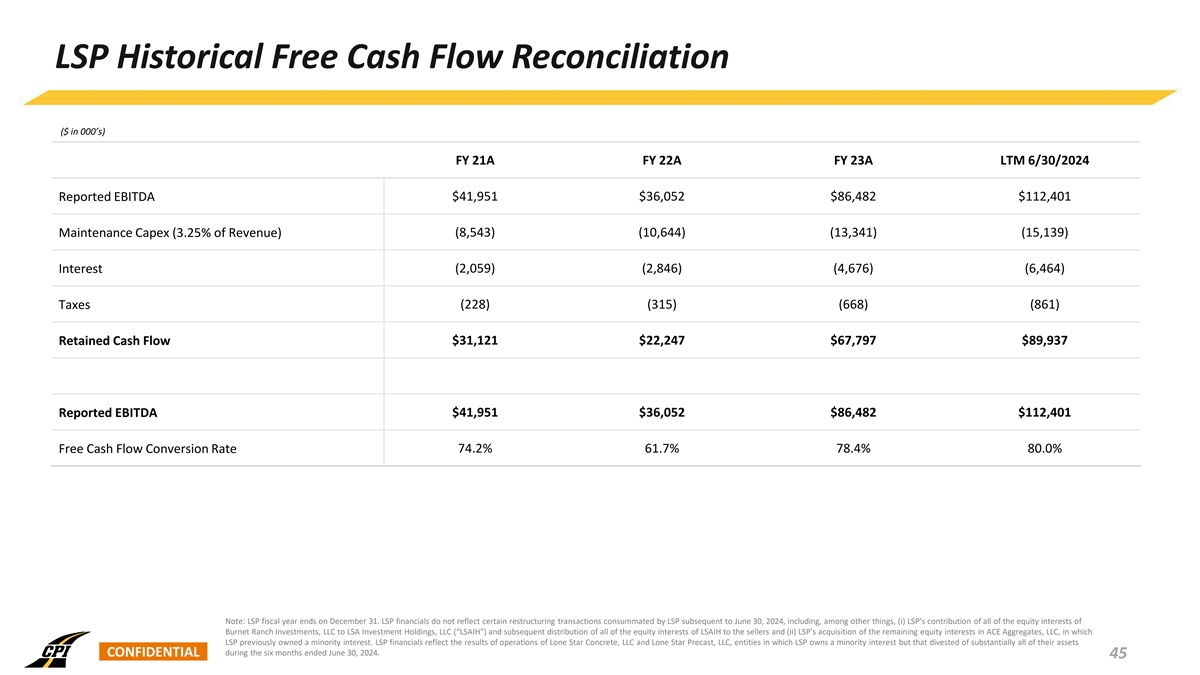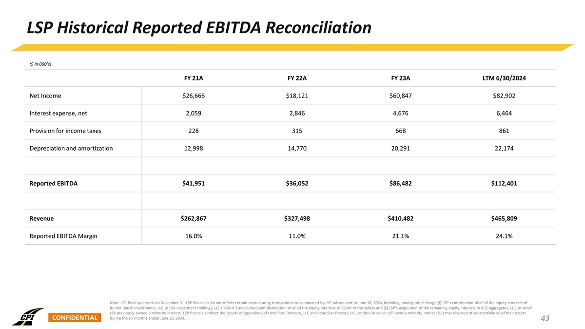 LSP Historical Reported EBITDA Reconciliation ($ in 000’s) FY 21A FY 22A FY 23A LTM 6/30/2024 Net Income $26,666 $18,121 $60,847 $82,902 Interest expense, net 2,059 2,846 4,676 6,464 Provision for income taxes 228 315 668 861 Depreciation and amortization 12,998 14,770 20,291 22,174 Reported EBITDA $41,951 $36,052 $86,482 $112,401 Revenue $262,867 $327,498 $410,482 $465,809 Reported EBITDA Margin 16.0% 11.0% 21.1% 24.1% Note: LSP fiscal year ends on December 31. LSP financials do not reflect certain restructuring transactions consummated by LSP subsequent to June 30, 2024, including, among other things, (i) LSP’s contribution of all of the equity interests of Burnet Ranch Investments, LLC to LSA Investment Holdings, LLC (“LSAIH”) and subsequent distribution of all of the equity interests of LSAIH to the sellers and (ii) LSP’s acquisition of the remaining equity interests in ACE Aggregates, LLC, in which LSP previously owned a minority interest. LSP financials reflect the results of operations of Lone Star Concrete, LLC and Lone Star Precast, LLC, entities in which LSP owns a minority interest but that divested of substantially all of their assets CONFIDENTIAL during the six months ended June 30, 2024. 43