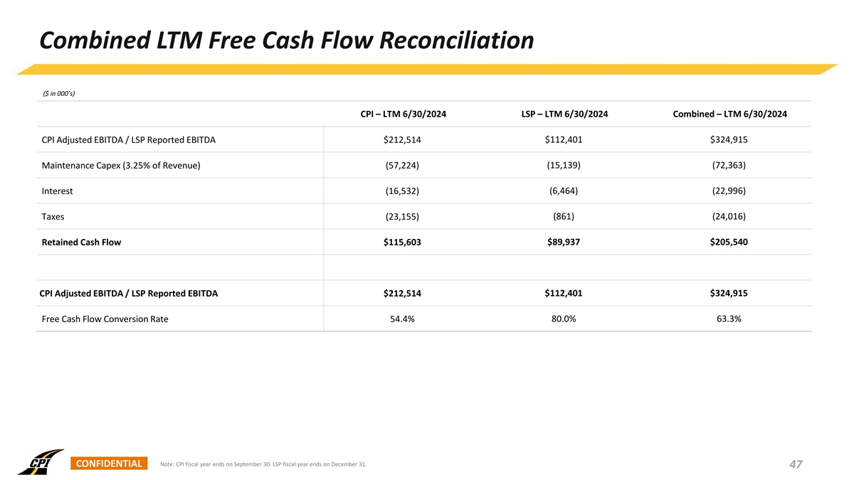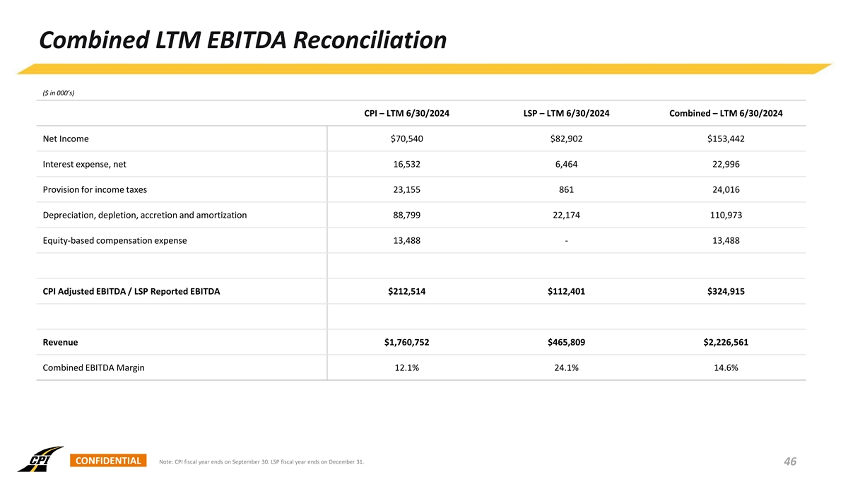 Combined LTM EBITDA Reconciliation ($ in 000’s) CPI – LTM 6/30/2024 LSP – LTM 6/30/2024 Combined – LTM 6/30/2024 Net Income $70,540 $82,902 $153,442 Interest expense, net 16,532 6,464 22,996 Provision for income taxes 23,155 861 24,016 Depreciation, depletion, accretion and amortization 88,799 22,174 110,973 Equity-based compensation expense 13,488 - 13,488 CPI Adjusted EBITDA / LSP Reported EBITDA $212,514 $112,401 $324,915 Revenue $1,760,752 $465,809 $2,226,561 Combined EBITDA Margin 12.1% 24.1% 14.6% CONFIDENTIAL Note: CPI fiscal year ends on September 30. LSP fiscal year ends on December 31. 46
