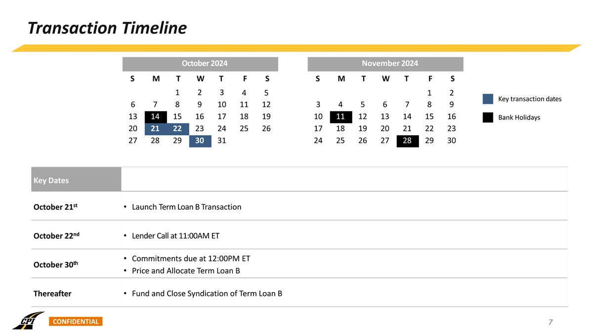 Transaction Timeline October 2024 November 2024 S M T W T F S S M T W T F S 1 2 3 4 5 1 2 Key transaction dates 6 7 8 9 10 11 12 3 4 5 6 7 8 9 13 14 15 16 17 18 19 10 11 12 13 14 15 16 Bank Holidays 20 21 22 23 24 25 26 17 18 19 20 21 22 23 27 28 29 30 31 24 25 26 27 28 29 30 Key Dates Events st October 21 • Launch Term Loan B Transaction nd October 22 • Lender Call at 11:00AM ET • Commitments due at 12:00PM ET th October 30 • Price and Allocate Term Loan B • Fund and Close Syndication of Term Loan B Thereafter CONFIDENTIAL 7