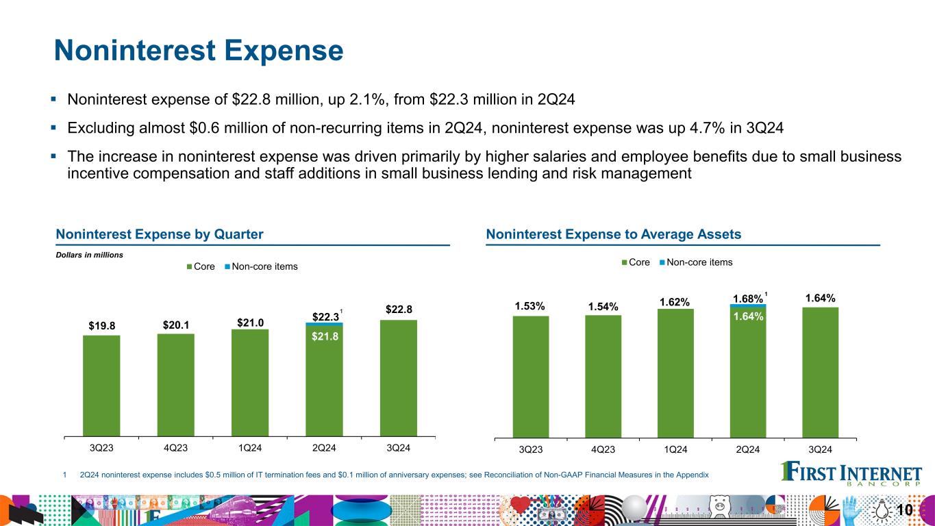 Noninterest expense totaled $22.8 million for the third quarter of 2024, compared to $22.3 million for the second quarter of 2024, and $19.8 million for the third quarter of 2023, representing increases of 2.1% and 15.4%, respectively. Excluding non-recurring costs of almost $0.6 million recognized in the second quarter of 2024, noninterest expense increased $1.0 million, or 4.7%, in the third quarter of 2024 from the linked quarter. The increase was driven mainly by higher salaries and employee benefits due to higher small business lending incentive compensation as well as staff additions in small business lending and risk management.
