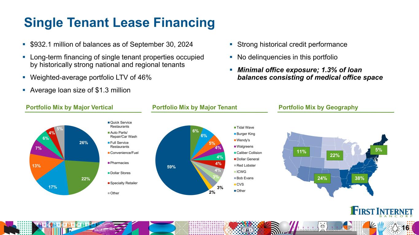 Franchise Finance $550.4 million of balances as of September 30, 2024 Focused on providing growth financing to franchisees in a variety of industry segments Average loan size of $0.8 million 15 Portfolio Mix by Borrower Use Portfolio Mix by State Portfolio Mix by Brand 131 21% 15% 14%13% 10% 5% 22% Limited-Service Restaurants Indoor Recreation Beauty Salons Snacks and Nonalcoholic Beverages Fitness and Recreational Sports Centers Other Personal Care Services Other 14% 12% 6% 5% 5% 4%3% 51% TX CA FL PA MI GA NY Other 9% 8% 7% 6% 4% 4% 62% Urban Air Adventure Park Scooter's Coffee My Salon Suite Goldfish Swim School Restore Hyper Wellness Jersey Mike's Other