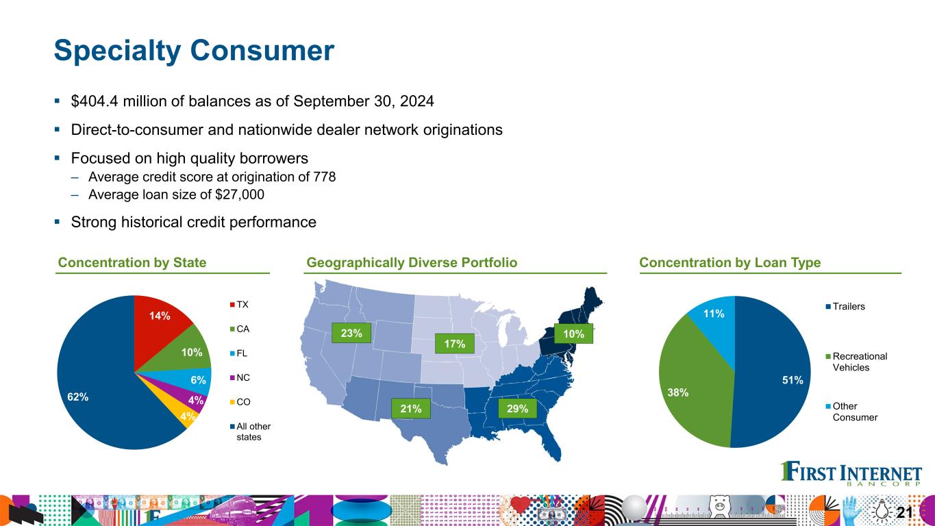 23% 21% 17% 29% 10% Specialty Consumer $404.4 million of balances as of September 30, 2024 Direct-to-consumer and nationwide dealer network originations Focused on high quality borrowers – Average credit score at origination of 778 – Average loan size of $27,000 Strong historical credit performance Concentration by State Concentration by Loan TypeGeographically Diverse Portfolio 211 14% 10% 6% 4% 4% 62% TX CA FL NC CO All other states 51% 38% 11% Trailers Recreational Vehicles Other Consumer