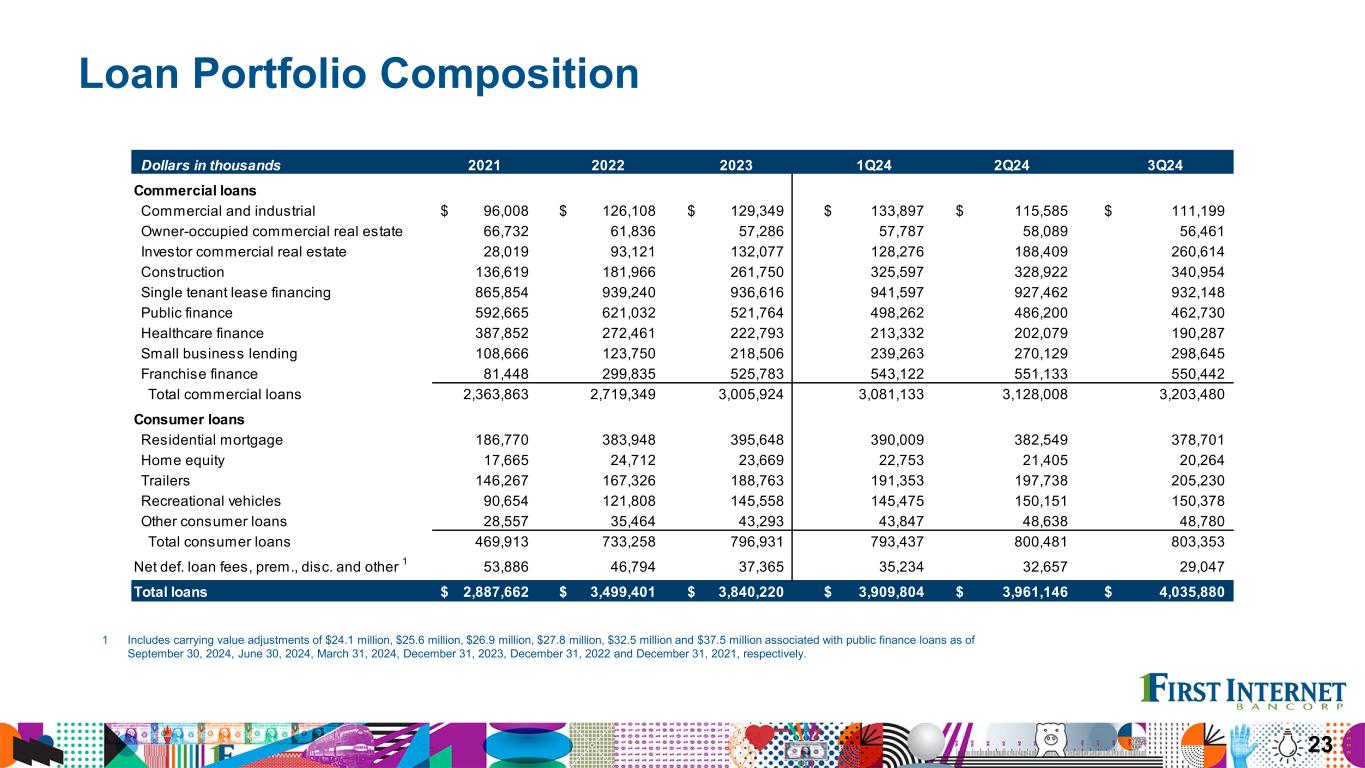 Total loans as of September 30, 2024, were $4.0 billion, an increase of $74.7 million, or 1.9%, compared to June 30, 2024, and an increase of $300.8 million, or 8.1%, compared to September 30, 2023. Total commercial loan balances were $3.2 billion as of September 30, 2024, an increase of $75.5 million, or 2.4%, compared to June 30, 2024, and an increase of $295.2 million, or 10.2%, compared to September 30, 2023. Compared to the linked quarter, the increase in commercial loan balances was driven primarily by growth in investor commercial real estate, small business lending and construction balances. These items were partially offset by decreases in the public finance, healthcare finance and commercial and industrial portfolios. Quarter-end balances in the commercial and industrial and public finance portfolios were impacted by early payoffs. The increase in investor commercial real estate balances included loans with strong variable rate pricing that converted from construction loans upon project completion.