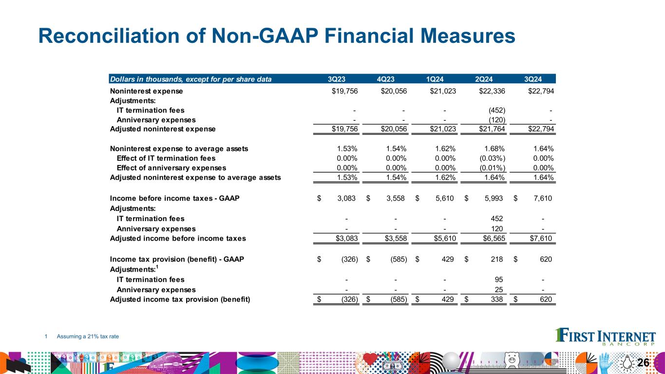 Reconciliation of Non-GAAP Financial Measures 25 1 Assuming a 21% tax rate Dollars in thousands, except for per share data 3Q23 4Q23 1Q24 2Q24 3Q24 Total equity - GAAP $347,744 $362,795 $366,739 $371,953 $385,129 Adjustments: Goodwill (4,687) (4,687) (4,687) (4,687) (4,687) Tangible common equity $343,057 $358,108 $362,052 $367,266 $380,442 Total assets - GAAP $5,169,023 $5,167,572 $5,340,667 $5,343,302 $5,823,259 Adjustments: Goodwill (4,687) (4,687) (4,687) (4,687) (4,687) Tangible assets $5,164,336 $5,162,885 $5,335,980 $5,338,615 $5,818,572 Common shares outstanding 8,669,673 8,644,451 8,655,854 8,667,894 8,667,894 Book value per common share $40.11 $41.97 $42.37 $42.91 $44.43 Effect of goodwill (0.54) (0.54) (0.54) (0.54) (0.54) Tangible book value per common share $39.57 $41.43 $41.83 $42.37 $43.89 Total shareholders' equity to assets 6.73% 7.02% 6.87% 6.96% 6.61% Effect of goodwill (0.09%) (0.08%) (0.08%) (0.08%) (0.07%) Tangible common equity to tangible assets 6.64% 6.94% 6.79% 6.88% 6.54% Total interest income $63,015 $66,272 $68,165 $70,961 $74,990 Adjustments: Fully-taxable equivalent adjustments 1 1,265 1,238 1,190 1,175 1,133 Total interest income - FTE $64,280 $67,510 $69,355 $72,136 $76,123 Net interest income $17,378 $19,807 $20,734 $21,327 $21,765 Adjustments: Fully-taxable equivalent adjustments 1 1,265 1,238 1,190 1,175 1,133 Net interest income - FTE $18,643 $21,045 $21,924 $22,502 $22,898 Net interest margin 1.39% 1.58% 1.66% 1.67% 1.62% Adjustments: Effect of fully-taxable equivalent adjustments 1 0.10% 0.10% 0.09% 0.09% 0.08% Net interest margin - FTE 1.49% 1.68% 1.75% 1.76% 1.70%