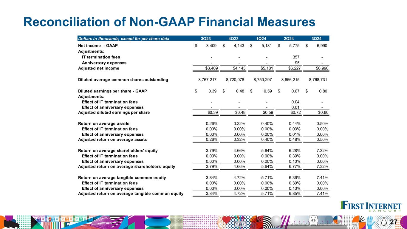 Reconciliation of Non-GAAP Financial Measures 26 1 Assuming a 21% tax rate Dollars in thousands, except for per share data 3Q23 4Q23 1Q24 2Q24 3Q24 Noninterest expense $19,756 $20,056 $21,023 $22,336 $22,794 Adjustments: IT termination fees - - - (452) - Anniversary expenses - - - (120) - Adjusted noninterest expense $19,756 $20,056 $21,023 $21,764 $22,794 Noninterest expense to average assets 1.53% 1.54% 1.62% 1.68% 1.64% Effect of IT termination fees 0.00% 0.00% 0.00% (0.03%) 0.00% Effect of anniversary expenses 0.00% 0.00% 0.00% (0.01%) 0.00% Adjusted noninterest expense to average assets 1.53% 1.54% 1.62% 1.64% 1.64% Income before income taxes - GAAP 3,083$ 3,558$ 5,610$ 5,993$ 7,610$ Adjustments: IT termination fees - - - 452 - Anniversary expenses - - - 120 - Adjusted income before income taxes $3,083 $3,558 $5,610 $6,565 $7,610 Income tax provision (benefit) - GAAP (326)$ (585)$ 429$ 218$ 620$ Adjustments:1 IT termination fees - - - 95 - Anniversary expenses - - - 25 - Adjusted income tax provision (benefit) (326)$ (585)$ 429$ 338$ 620$