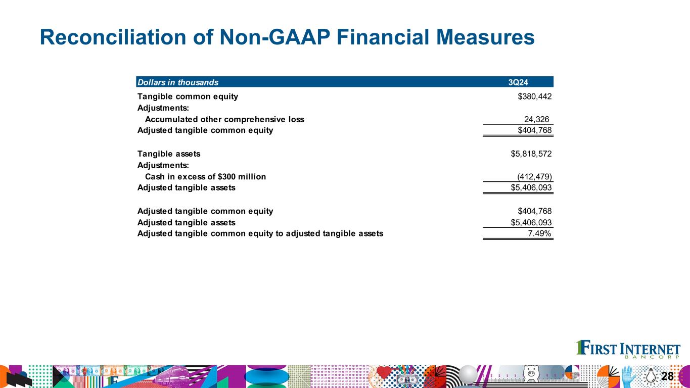 Reconciliation of Non-GAAP Financial Measures 27 Dollars in thousands, except for per share data 3Q23 4Q23 1Q24 2Q24 3Q24 Net income - GAAP 3,409$ 4,143$ 5,181$ 5,775$ 6,990$ Adjustments: IT termination fees - - - 357 - Anniversary expenses - - - 95 - Adjusted net income $3,409 $4,143 $5,181 $6,227 $6,990 Diluted average common shares outstanding 8,767,217 8,720,078 8,750,297 8,656,215 8,768,731 Diluted earnings per share - GAAP 0.39$ 0.48$ 0.59$ 0.67$ 0.80$ Adjustments: Effect of IT termination fees - - - 0.04 - Effect of anniversary expenses - - - 0.01 - Adjusted diluted earnings per share $0.39 $0.48 $0.59 $0.72 $0.80 Return on average assets 0.26% 0.32% 0.40% 0.44% 0.50% Effect of IT termination fees 0.00% 0.00% 0.00% 0.03% 0.00% Effect of anniversary expenses 0.00% 0.00% 0.00% 0.01% 0.00% Adjusted return on average assets 0.26% 0.32% 0.40% 0.48% 0.50% Return on average shareholders' equity 3.79% 4.66% 5.64% 6.28% 7.32% Effect of IT termination fees 0.00% 0.00% 0.00% 0.39% 0.00% Effect of anniversary expenses 0.00% 0.00% 0.00% 0.10% 0.00% Adjusted return on average shareholders' equity 3.79% 4.66% 5.64% 6.77% 7.32% Return on average tangible common equity 3.84% 4.72% 5.71% 6.36% 7.41% Effect of IT termination fees 0.00% 0.00% 0.00% 0.39% 0.00% Effect of anniversary expenses 0.00% 0.00% 0.00% 0.10% 0.00% Adjusted return on average tangible common equity 3.84% 4.72% 5.71% 6.85% 7.41%