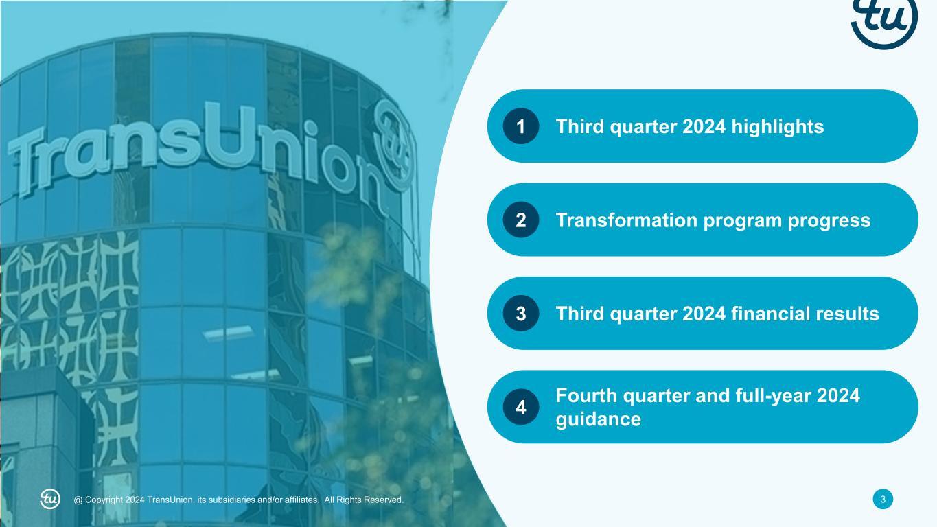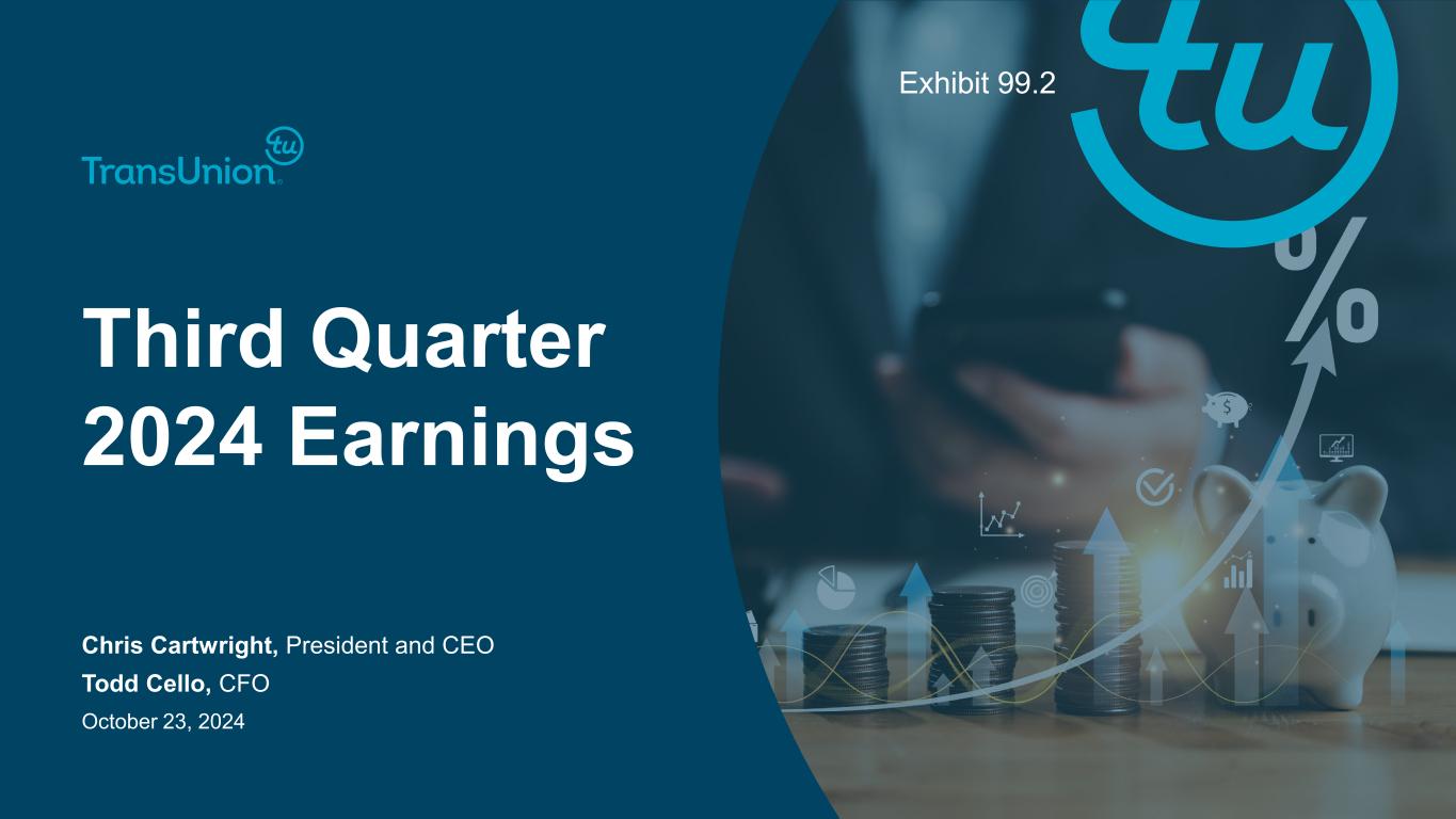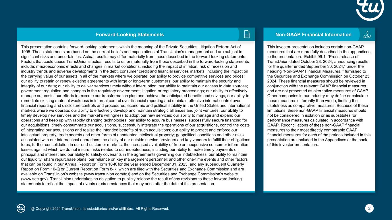2@ Copyright 2024 TransUnion, its subsidiaries and/or affiliates. All Rights Reserved. Non-GAAP Financial InformationForward-Looking Statements This presentation contains forward-looking statements within the meaning of the Private Securities Litigation Reform Act of 1995. These statements are based on the current beliefs and expectations of TransUnion’s management and are subject to significant risks and uncertainties. Actual results may differ materially from those described in the forward-looking statements. Factors that could cause TransUnion’s actual results to differ materially from those described in the forward-looking statements include: macroeconomic effects and changes in market conditions, including the impact of inflation, risk of recession and industry trends and adverse developments in the debt, consumer credit and financial services markets, including the impact on the carrying value of our assets in all of the markets where we operate; our ability to provide competitive services and prices; our ability to retain or renew existing agreements with large or long-term customers; our ability to maintain the security and integrity of our data; our ability to deliver services timely without interruption; our ability to maintain our access to data sources; government regulation and changes in the regulatory environment; litigation or regulatory proceedings; our ability to effectively manage our costs; our efforts to execute our transformation plan and achieve the anticipated benefits and savings; our ability to remediate existing material weakness in internal control over financial reporting and maintain effective internal control over financial reporting and disclosure controls and procedures; economic and political stability in the United States and international markets where we operate; our ability to effectively develop and maintain strategic alliances and joint ventures; our ability to timely develop new services and the market’s willingness to adopt our new services; our ability to manage and expand our operations and keep up with rapidly changing technologies; our ability to acquire businesses, successfully secure financing for our acquisitions, timely consummate our acquisitions, successfully integrate the operations of our acquisitions, control the costs of integrating our acquisitions and realize the intended benefits of such acquisitions; our ability to protect and enforce our intellectual property, trade secrets and other forms of unpatented intellectual property; geopolitical conditions and other risks associated with our international operations; the ability of our outside service providers and key vendors to fulfill their obligations to us; further consolidation in our end-customer markets; the increased availability of free or inexpensive consumer information; losses against which we do not insure; risks related to our indebtedness, including our ability to make timely payments of principal and interest and our ability to satisfy covenants in the agreements governing our indebtedness; our ability to maintain our liquidity; share repurchase plans; our reliance on key management personnel; and other one-time events and other factors that can be found in our Annual Report on Form 10-K for the year ended December 31, 2023, and any subsequent Quarterly Report on Form 10-Q or Current Report on Form 8-K, which are filed with the Securities and Exchange Commission and are available on TransUnion’s website (www.transunion.com/tru) and on the Securities and Exchange Commission’s website (www.sec.gov). TransUnion undertakes no obligation to publicly release the result of any revisions to these forward-looking statements to reflect the impact of events or circumstances that may arise after the date of this presentation. This investor presentation includes certain non-GAAP measures that are more fully described in the appendices to the presentation. Exhibit 99.1, “Press release of TransUnion dated October 23, 2024, announcing results for the quarter ended September 30, 2024,” under the heading ‘Non-GAAP Financial Measures,’” furnished to the Securities and Exchange Commission on October 23, 2024. These financial measures should be reviewed in conjunction with the relevant GAAP financial measures and are not presented as alternative measures of GAAP. Other companies in our industry may define or calculate these measures differently than we do, limiting their usefulness as comparative measures. Because of these limitations, these non-GAAP financial measures should not be considered in isolation or as substitutes for performance measures calculated in accordance with GAAP. Reconciliations of these non-GAAP financial measures to their most directly comparable GAAP financial measures for each of the periods included in this presentation are included in the Appendices at the back of this investor presentation..