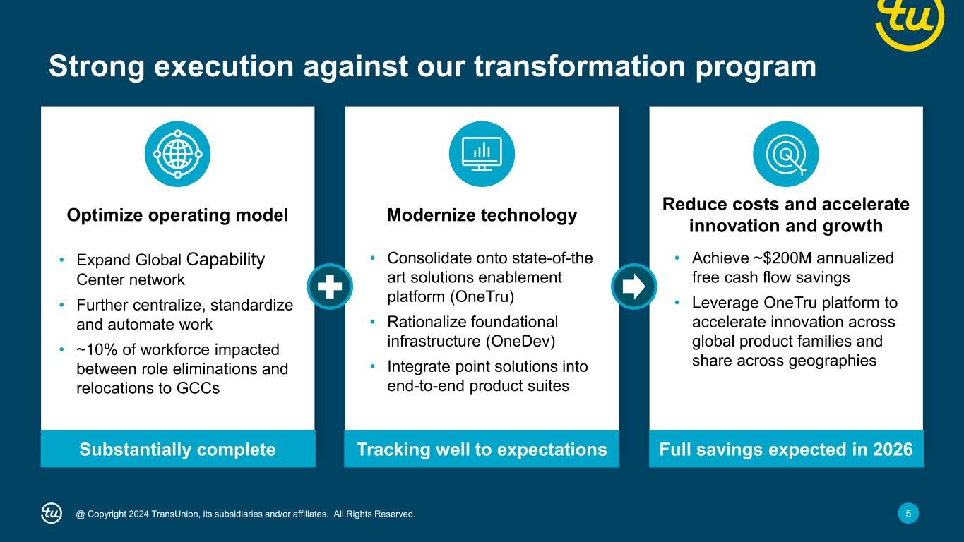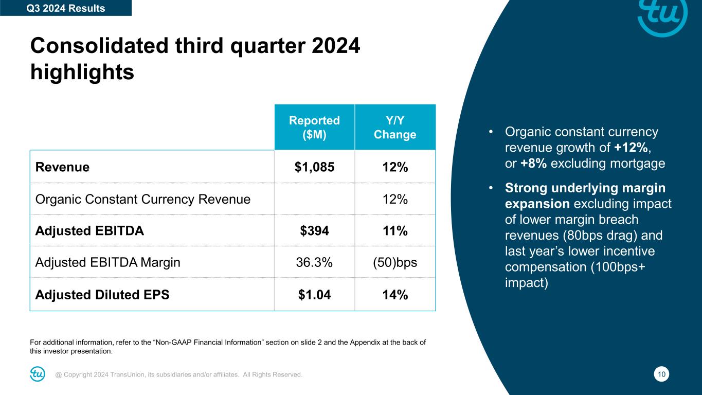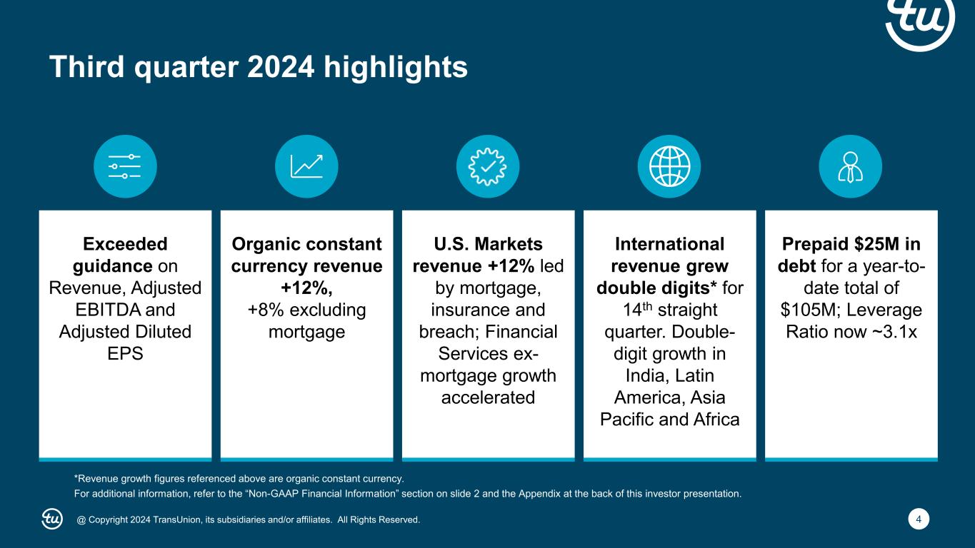 2@ Copyright 2024 TransUnion, its subsidiaries and/or affiliates. All Rights Reserved. Non-GAAP Financial InformationForward-Looking Statements This presentation contains forward-looking statements within the meaning of the Private Securities Litigation Reform Act of 1995. These statements are based on the current beliefs and expectations of TransUnion’s management and are subject to significant risks and uncertainties. Actual results may differ materially from those described in the forward-looking statements. Factors that could cause TransUnion’s actual results to differ materially from those described in the forward-looking statements include: macroeconomic effects and changes in market conditions, including the impact of inflation, risk of recession and industry trends and adverse developments in the debt, consumer credit and financial services markets, including the impact on the carrying value of our assets in all of the markets where we operate; our ability to provide competitive services and prices; our ability to retain or renew existing agreements with large or long-term customers; our ability to maintain the security and integrity of our data; our ability to deliver services timely without interruption; our ability to maintain our access to data sources; government regulation and changes in the regulatory environment; litigation or regulatory proceedings; our ability to effectively manage our costs; our efforts to execute our transformation plan and achieve the anticipated benefits and savings; our ability to remediate existing material weakness in internal control over financial reporting and maintain effective internal control over financial reporting and disclosure controls and procedures; economic and political stability in the United States and international markets where we operate; our ability to effectively develop and maintain strategic alliances and joint ventures; our ability to timely develop new services and the market’s willingness to adopt our new services; our ability to manage and expand our operations and keep up with rapidly changing technologies; our ability to acquire businesses, successfully secure financing for our acquisitions, timely consummate our acquisitions, successfully integrate the operations of our acquisitions, control the costs of integrating our acquisitions and realize the intended benefits of such acquisitions; our ability to protect and enforce our intellectual property, trade secrets and other forms of unpatented intellectual property; geopolitical conditions and other risks associated with our international operations; the ability of our outside service providers and key vendors to fulfill their obligations to us; further consolidation in our end-customer markets; the increased availability of free or inexpensive consumer information; losses against which we do not insure; risks related to our indebtedness, including our ability to make timely payments of principal and interest and our ability to satisfy covenants in the agreements governing our indebtedness; our ability to maintain our liquidity; share repurchase plans; our reliance on key management personnel; and other one-time events and other factors that can be found in our Annual Report on Form 10-K for the year ended December 31, 2023, and any subsequent Quarterly Report on Form 10-Q or Current Report on Form 8-K, which are filed with the Securities and Exchange Commission and are available on TransUnion’s website (www.transunion.com/tru) and on the Securities and Exchange Commission’s website (www.sec.gov). TransUnion undertakes no obligation to publicly release the result of any revisions to these forward-looking statements to reflect the impact of events or circumstances that may arise after the date of this presentation. This investor presentation includes certain non-GAAP measures that are more fully described in the appendices to the presentation. Exhibit 99.1, “Press release of TransUnion dated October 23, 2024, announcing results for the quarter ended September 30, 2024,” under the heading ‘Non-GAAP Financial Measures,’” furnished to the Securities and Exchange Commission on October 23, 2024. These financial measures should be reviewed in conjunction with the relevant GAAP financial measures and are not presented as alternative measures of GAAP. Other companies in our industry may define or calculate these measures differently than we do, limiting their usefulness as comparative measures. Because of these limitations, these non-GAAP financial measures should not be considered in isolation or as substitutes for performance measures calculated in accordance with GAAP. Reconciliations of these non-GAAP financial measures to their most directly comparable GAAP financial measures for each of the periods included in this presentation are included in the Appendices at the back of this investor presentation..