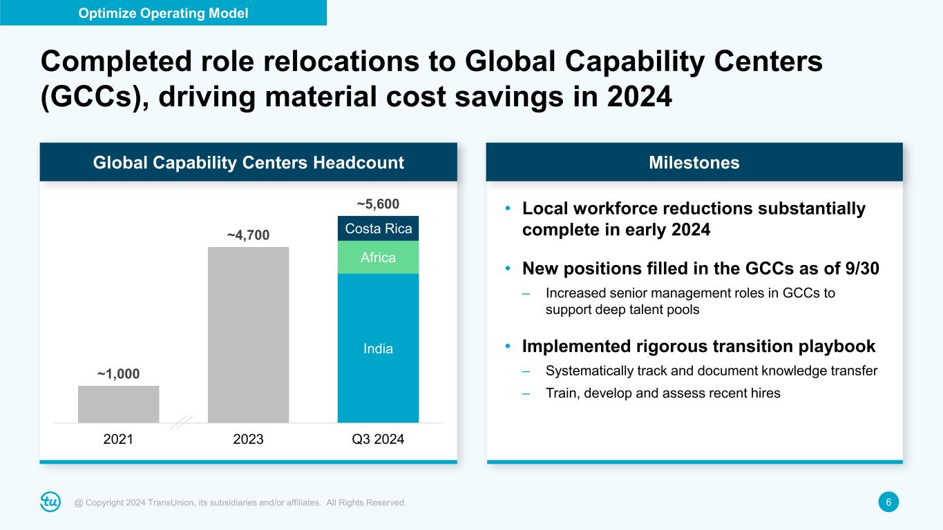 5@ Copyright 2024 TransUnion, its subsidiaries and/or affiliates. All Rights Reserved. • Expand Global Capability Center network • Further centralize, standardize and automate work • ~10% of workforce impacted between role eliminations and relocations to GCCs • Consolidate onto state-of-the art solutions enablement platform (OneTru) • Rationalize foundational infrastructure (OneDev) • Integrate point solutions into end-to-end product suites • Achieve ~$200M annualized free cash flow savings • Leverage OneTru platform to accelerate innovation across global product families and share across geographies Optimize operating model Modernize technology Reduce costs and accelerate innovation and growth Strong execution against our transformation program Substantially complete Tracking well to expectations Full savings expected in 2026