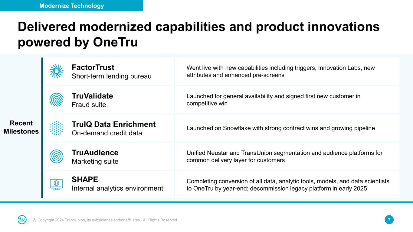 6@ Copyright 2024 TransUnion, its subsidiaries and/or affiliates. All Rights Reserved. • Local workforce reductions substantially complete in early 2024 • New positions filled in the GCCs as of 9/30 – Increased senior management roles in GCCs to support deep talent pools • Implemented rigorous transition playbook – Systematically track and document knowledge transfer – Train, develop and assess recent hires Completed role relocations to Global Capability Centers (GCCs), driving material cost savings in 2024 India Africa Costa Rica ~1,000 ~4,700 ~5,600 2021 2023 Q3 2024 Optimize Operating Model Global Capability Centers Headcount Milestones