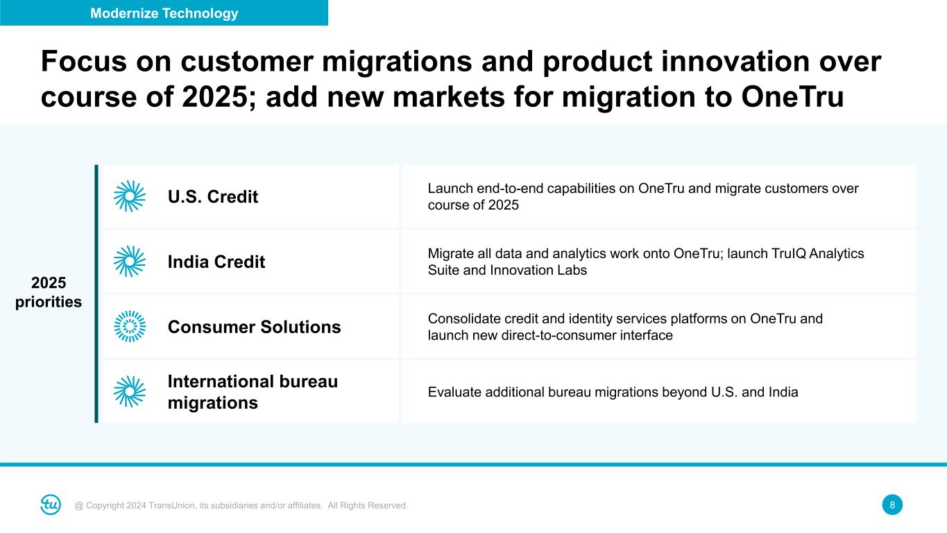 7@ Copyright 2024 TransUnion, its subsidiaries and/or affiliates. All Rights Reserved. Delivered modernized capabilities and product innovations powered by OneTru Modernize Technology Recent Milestones TruIQ Data Enrichment On-demand credit data Launched on Snowflake with strong contract wins and growing pipeline FactorTrust Short-term lending bureau Went live with new capabilities including triggers, Innovation Labs, new attributes and enhanced pre-screens TruValidate Fraud suite Launched for general availability and signed first new customer in competitive win TruAudience Marketing suite Unified Neustar and TransUnion segmentation and audience platforms for common delivery layer for customers SHAPE Internal analytics environment Completing conversion of all data, analytic tools, models, and data scientists to OneTru by year-end; decommission legacy platform in early 2025