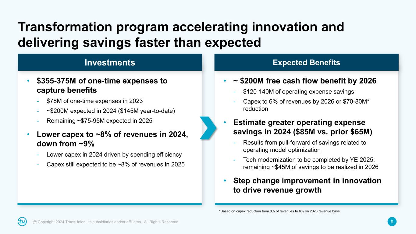 8@ Copyright 2024 TransUnion, its subsidiaries and/or affiliates. All Rights Reserved. Focus on customer migrations and product innovation over course of 2025; add new markets for migration to OneTru Modernize Technology 2025 priorities Consumer Solutions Consolidate credit and identity services platforms on OneTru and launch new direct-to-consumer interface U.S. Credit Launch end-to-end capabilities on OneTru and migrate customers over course of 2025 India Credit Migrate all data and analytics work onto OneTru; launch TruIQ Analytics Suite and Innovation Labs International bureau migrations Evaluate additional bureau migrations beyond U.S. and India