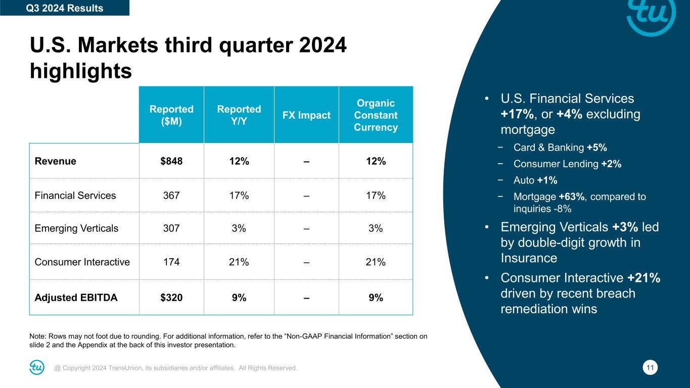 10@ Copyright 2024 TransUnion, its subsidiaries and/or affiliates. All Rights Reserved. Consolidated third quarter 2024 highlights For additional information, refer to the “Non-GAAP Financial Information” section on slide 2 and the Appendix at the back of this investor presentation. Reported ($M) Y/Y Change Revenue $1,085 12% Organic Constant Currency Revenue 12% Adjusted EBITDA $394 11% Adjusted EBITDA Margin 36.3% (50)bps Adjusted Diluted EPS $1.04 14% • Organic constant currency revenue growth of +12%, or +8% excluding mortgage • Strong underlying margin expansion excluding impact of lower margin breach revenues (80bps drag) and last year’s lower incentive compensation (100bps+ impact) Q3 2024 Results