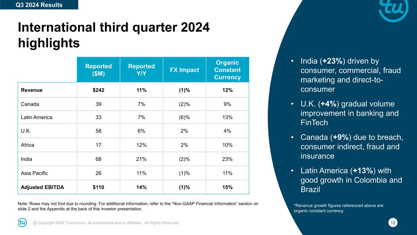 11@ Copyright 2024 TransUnion, its subsidiaries and/or affiliates. All Rights Reserved. U.S. Markets third quarter 2024 highlights Note: Rows may not foot due to rounding. For additional information, refer to the “Non-GAAP Financial Information” section on slide 2 and the Appendix at the back of this investor presentation. • U.S. Financial Services +17%, or +4% excluding mortgage − Card & Banking +5% − Consumer Lending +2% − Auto +1% − Mortgage +63%, compared to inquiries -8% • Emerging Verticals +3% led by double-digit growth in Insurance • Consumer Interactive +21% driven by recent breach remediation wins Reported ($M) Reported Y/Y FX Impact Organic Constant Currency Revenue $848 12% – 12% Financial Services 367 17% – 17% Emerging Verticals 307 3% – 3% Consumer Interactive 174 21% – 21% Adjusted EBITDA $320 9% – 9% Q3 2024 Results